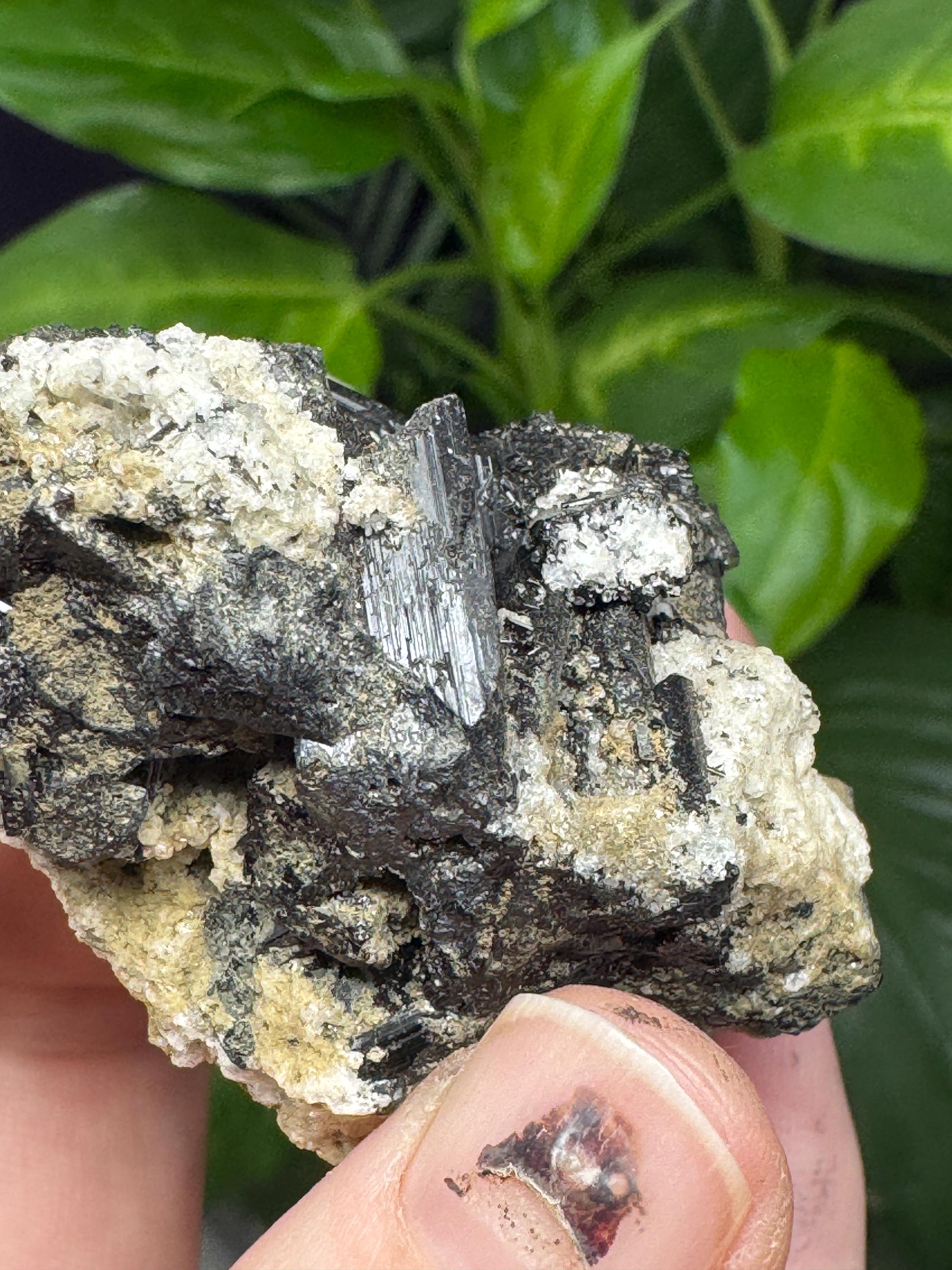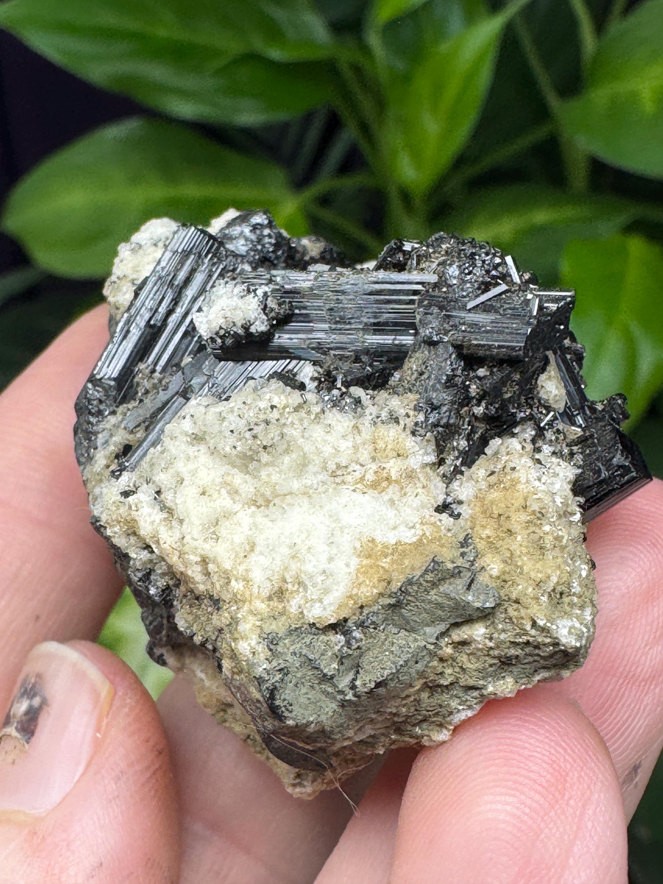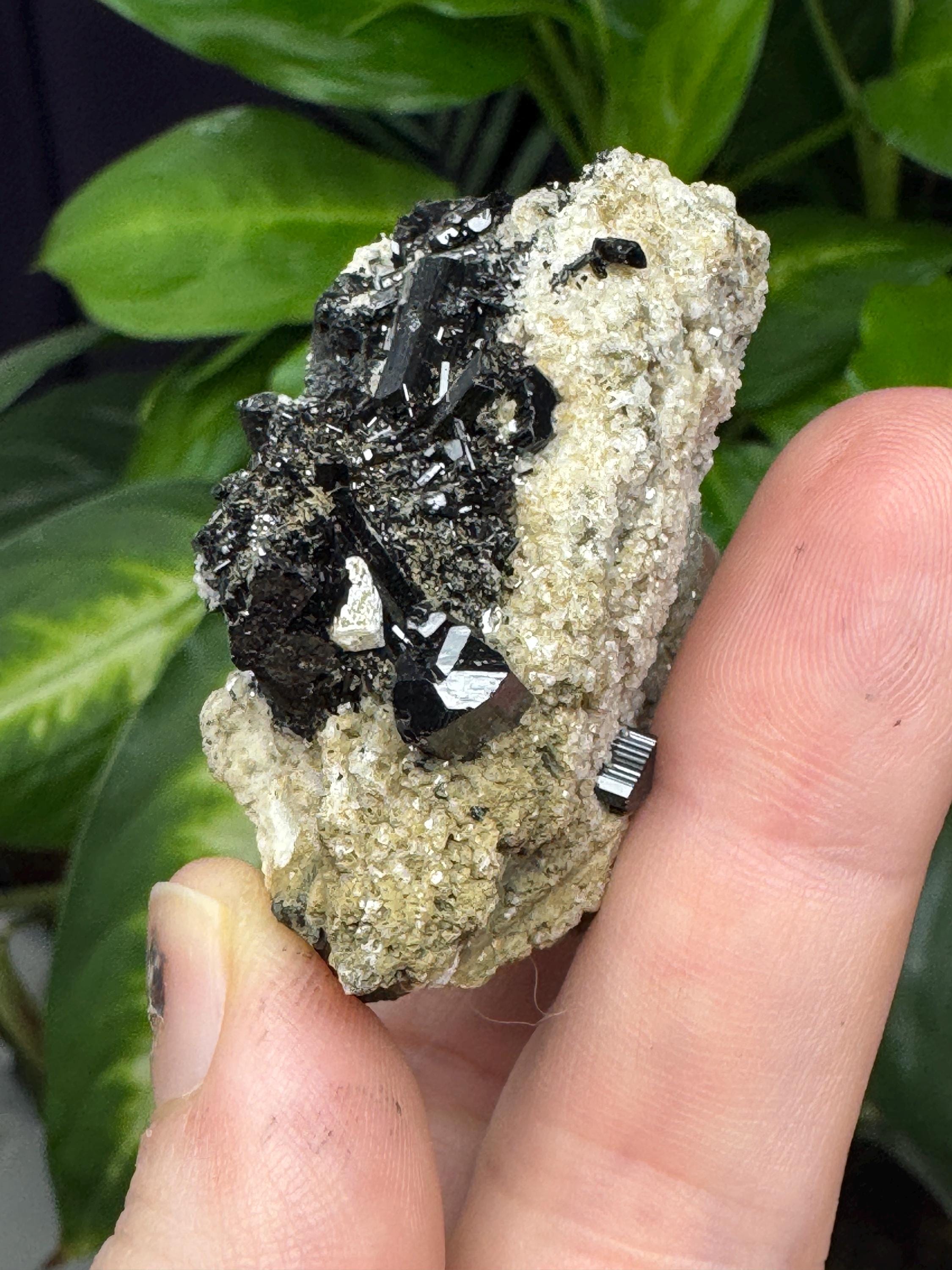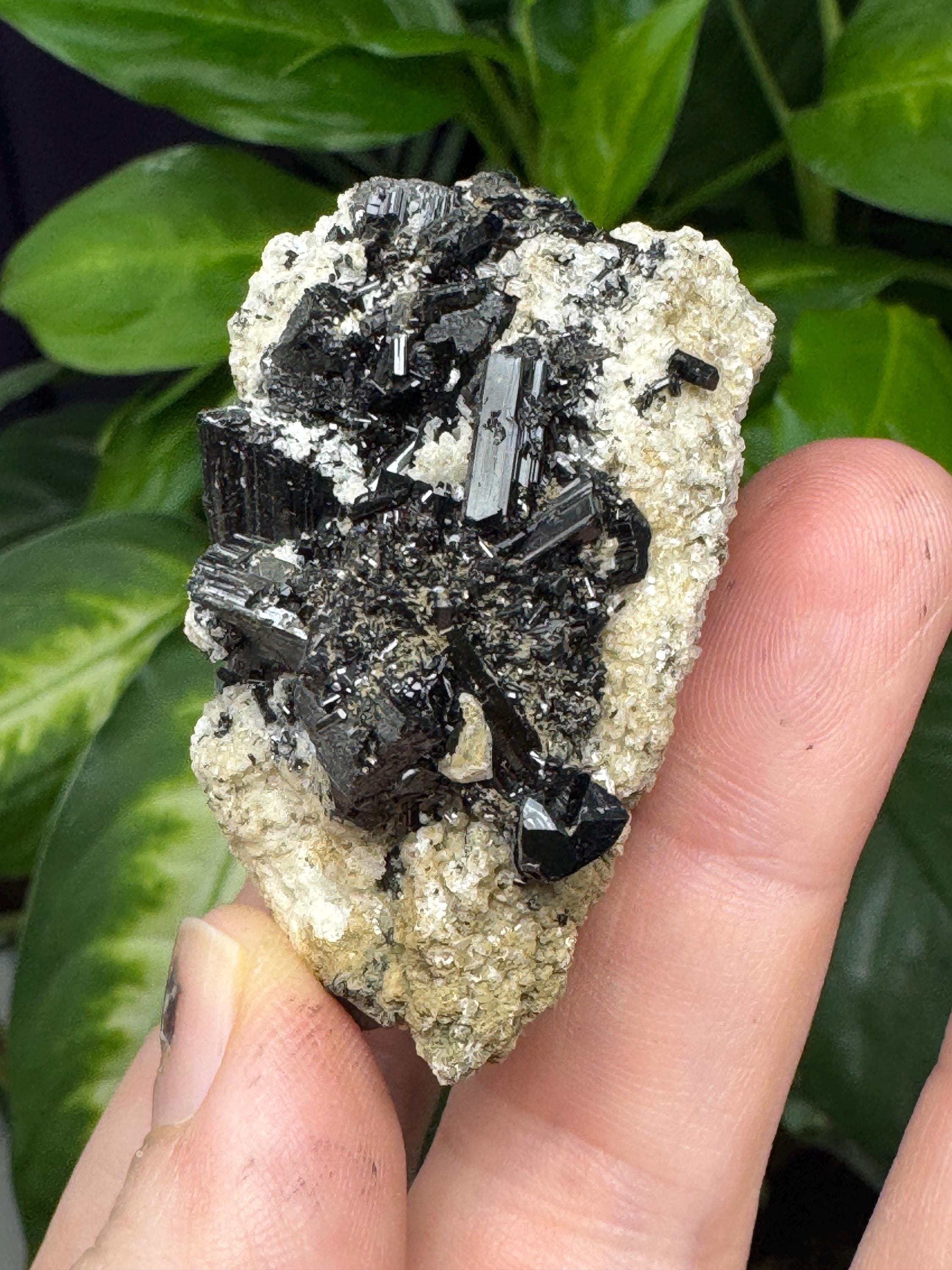 Black Schorl Cluster on Albite from North American Emerald Mine, Hiddenite, NC. Collected by Terry Ledford. Schorl cluster with luster and aesthetics. Comes with a collection card. 5.5 x 3.75cm