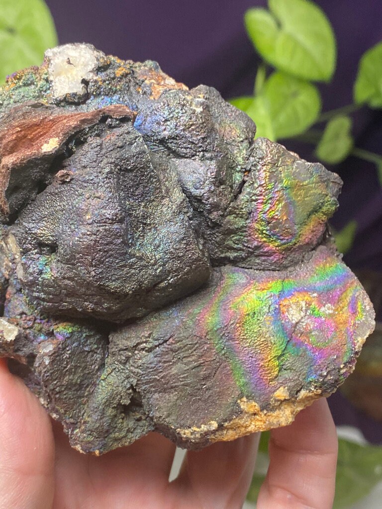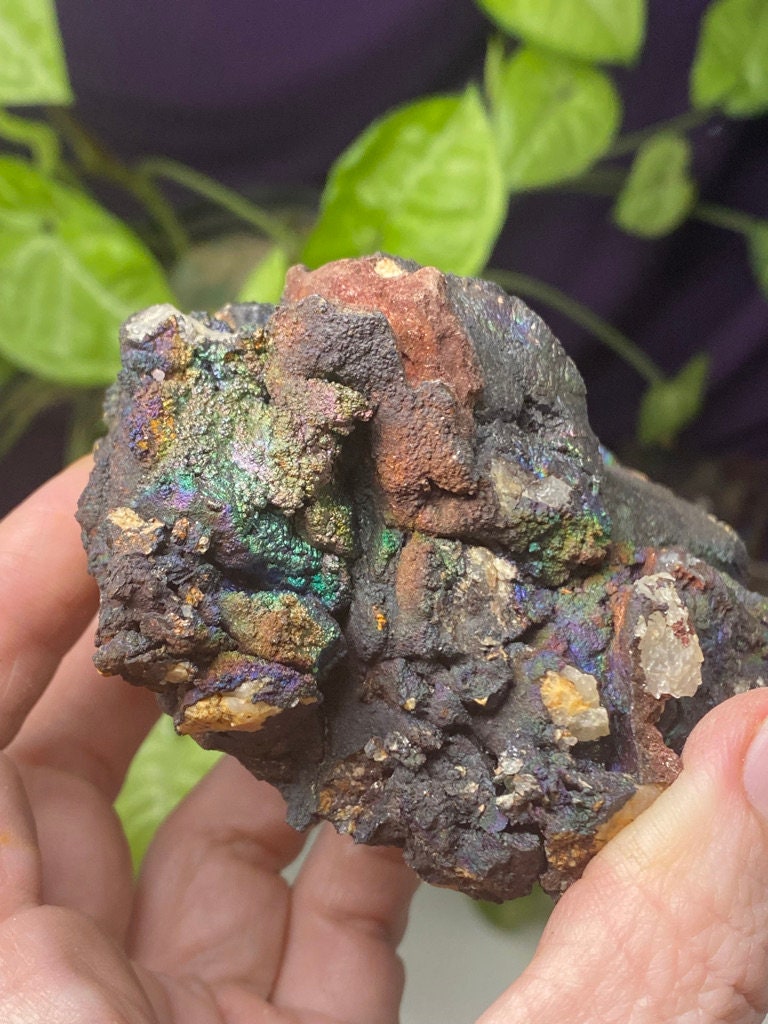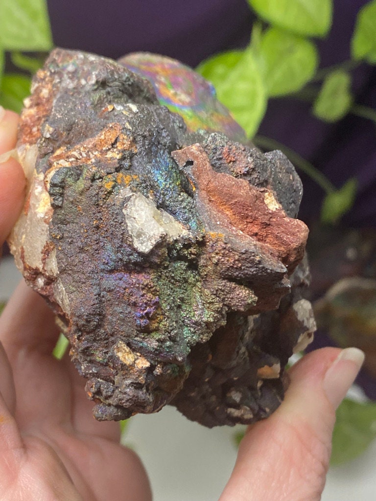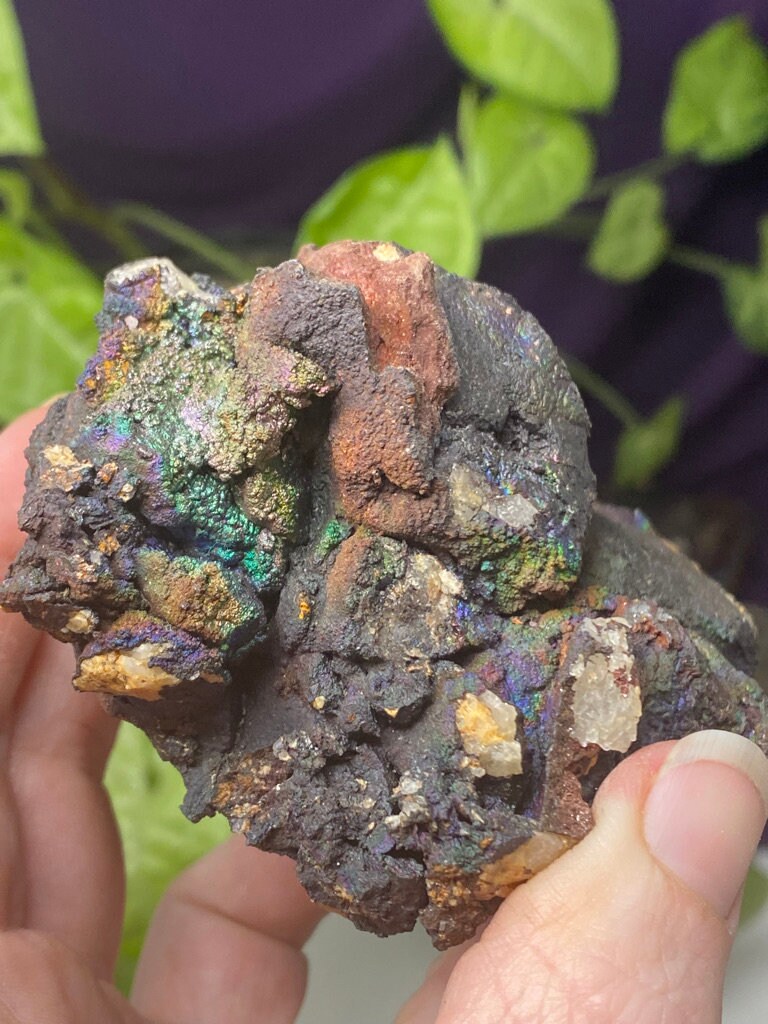 Quartz with colorful Iridescent Hematite from Graves Mountain Mine in GA. This piece has great color! Collected by the Late Terry Ledford.Make sure to check your piece to see if it changes color with your breath!!9 x 5cm