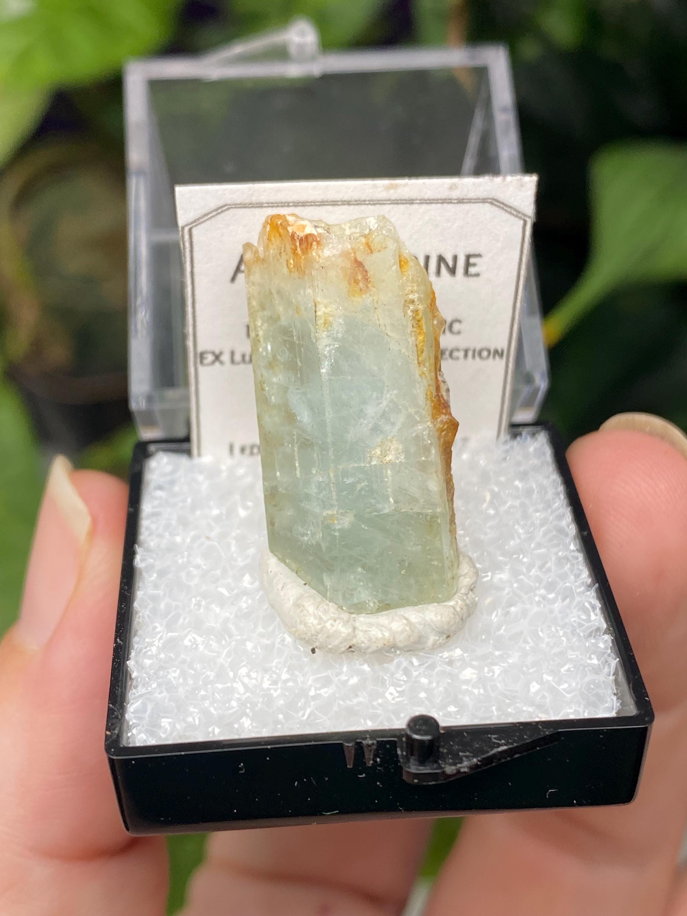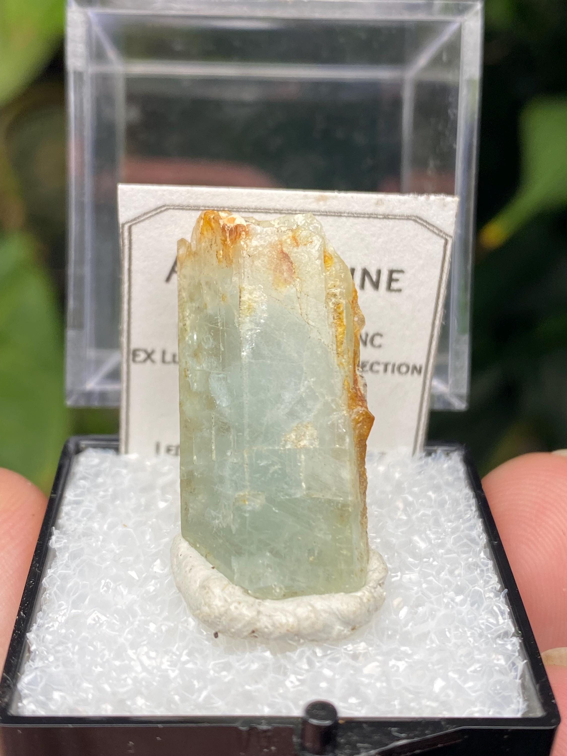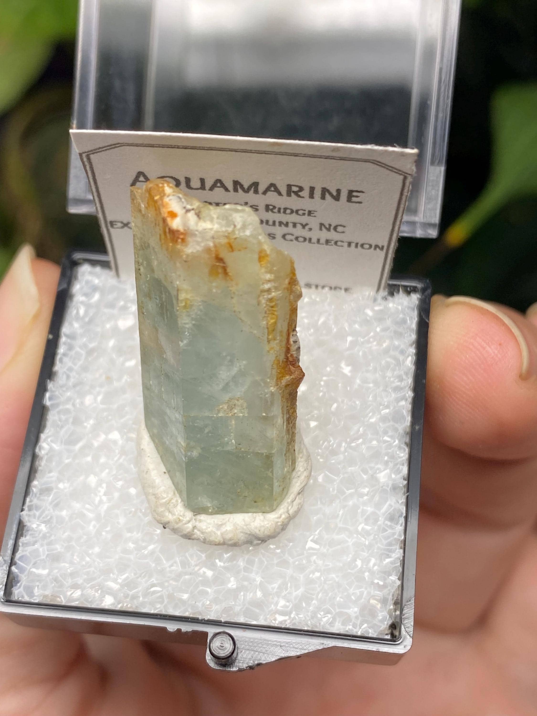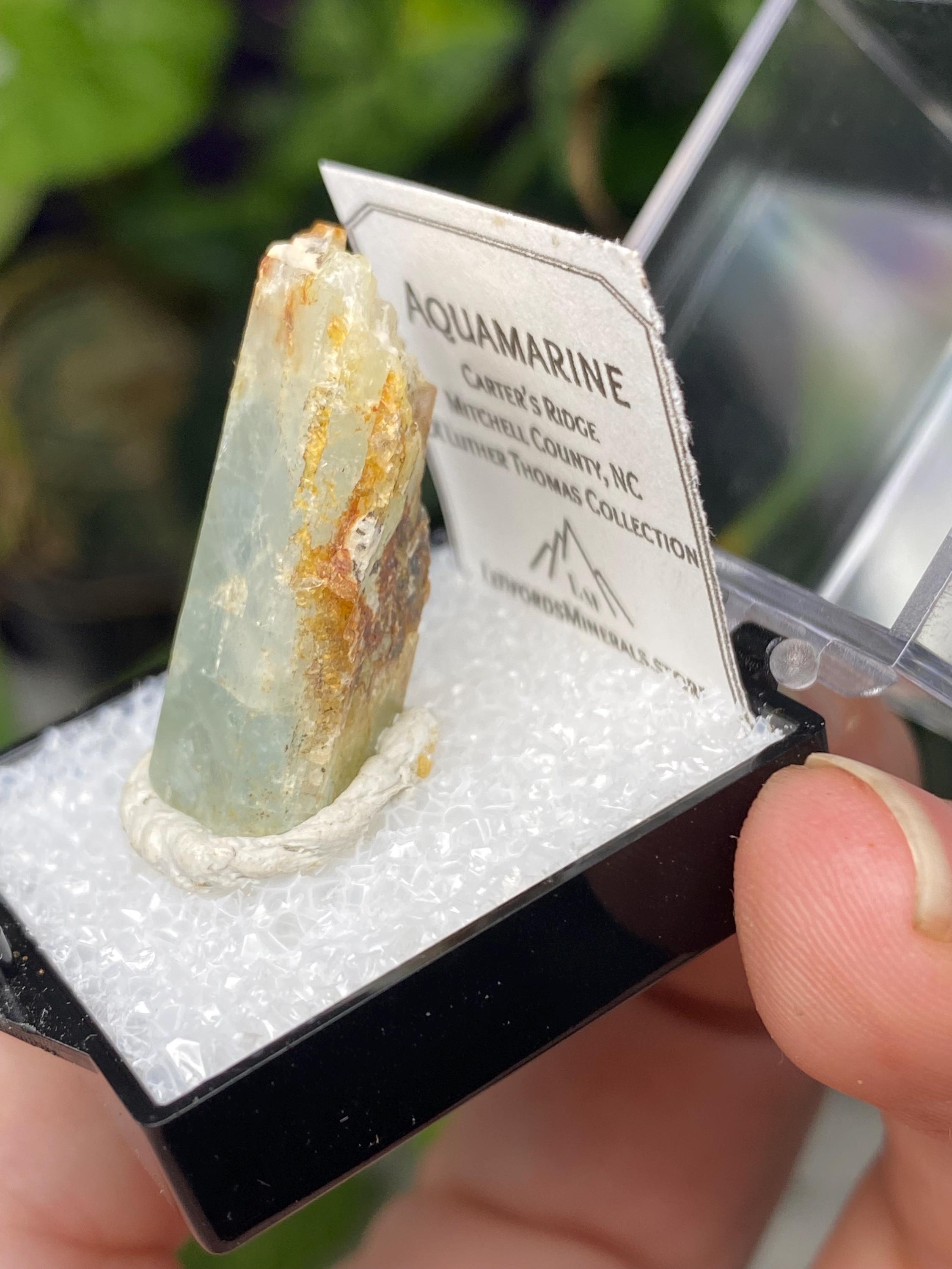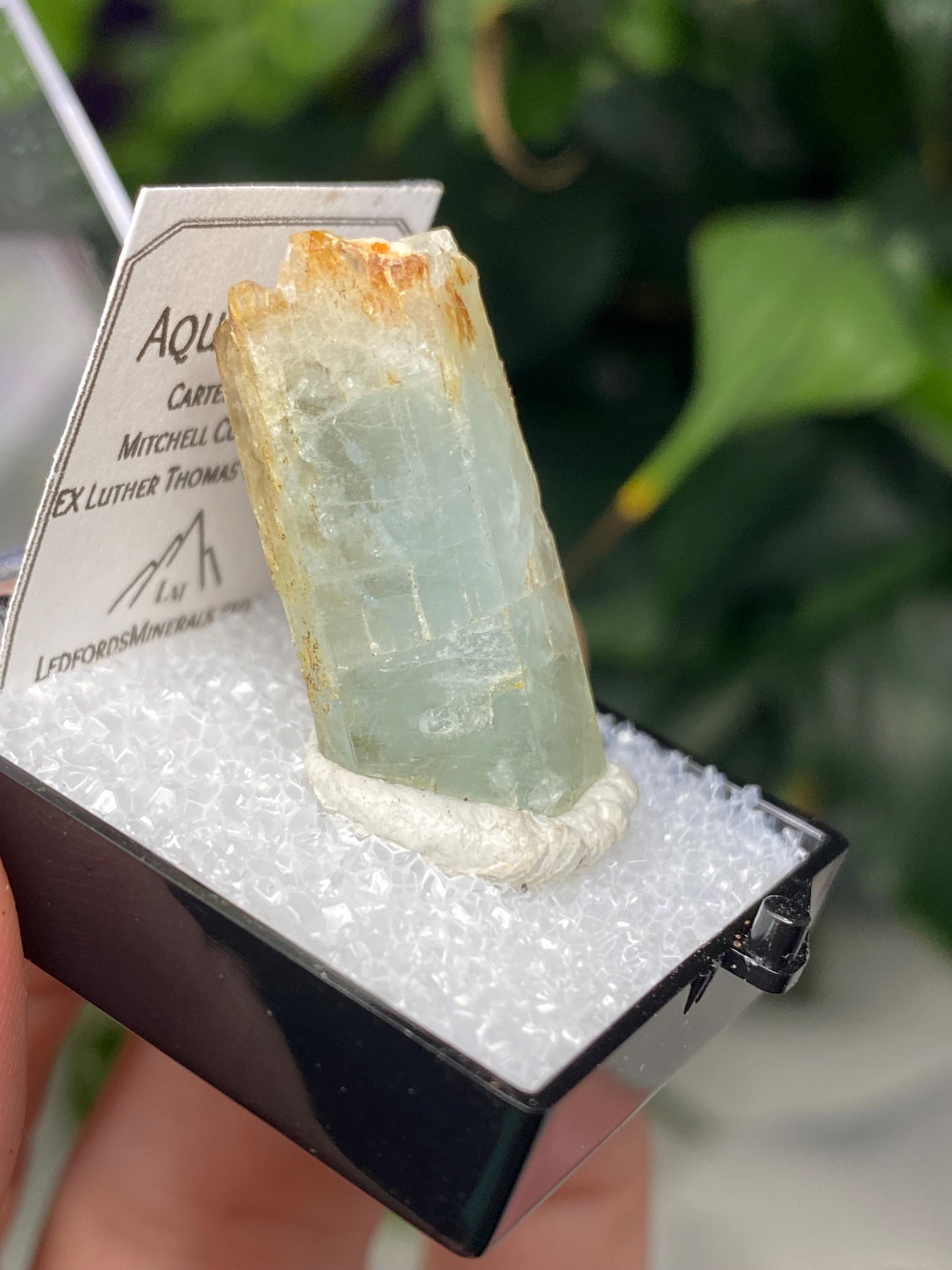 Sweet Beryl var Aquamarine Crystal from Carter's Ridge, Spruce Pine, NC. Now closed location. Old Find. This location is known for Beryl that will cats eye when cut. From the Luther Thomas Collection and Comes with a mineral card.