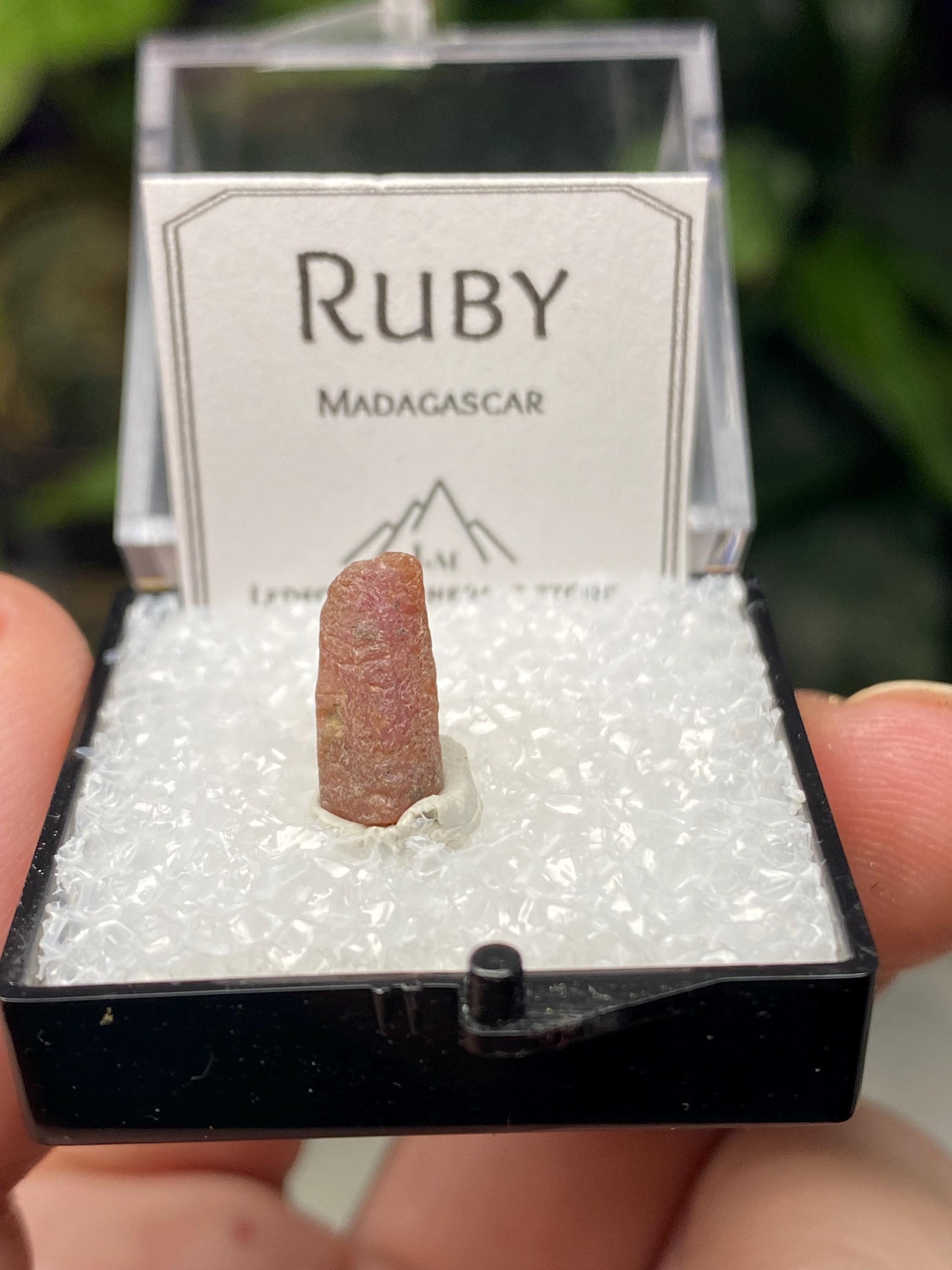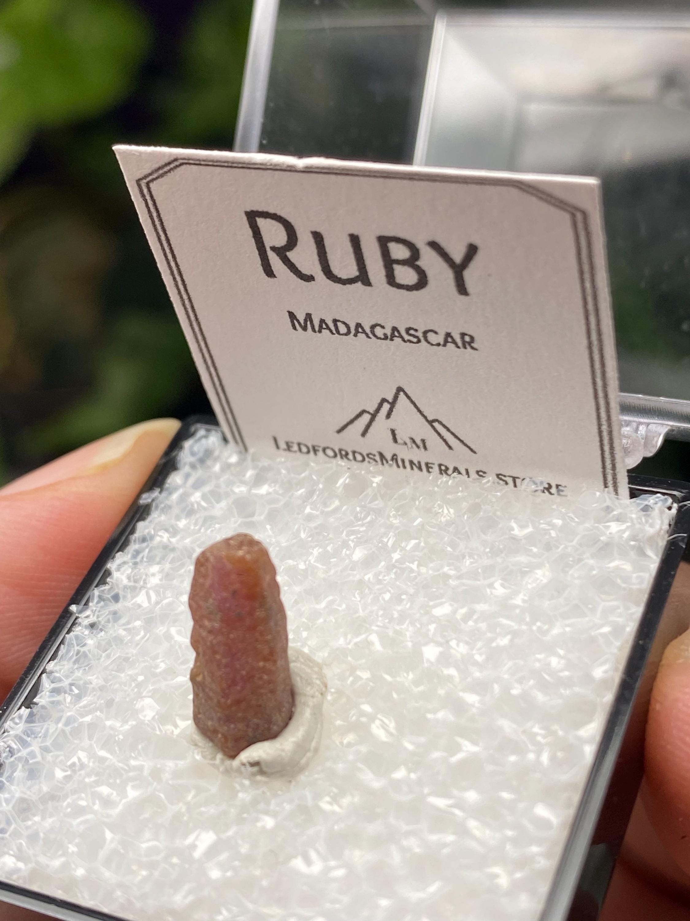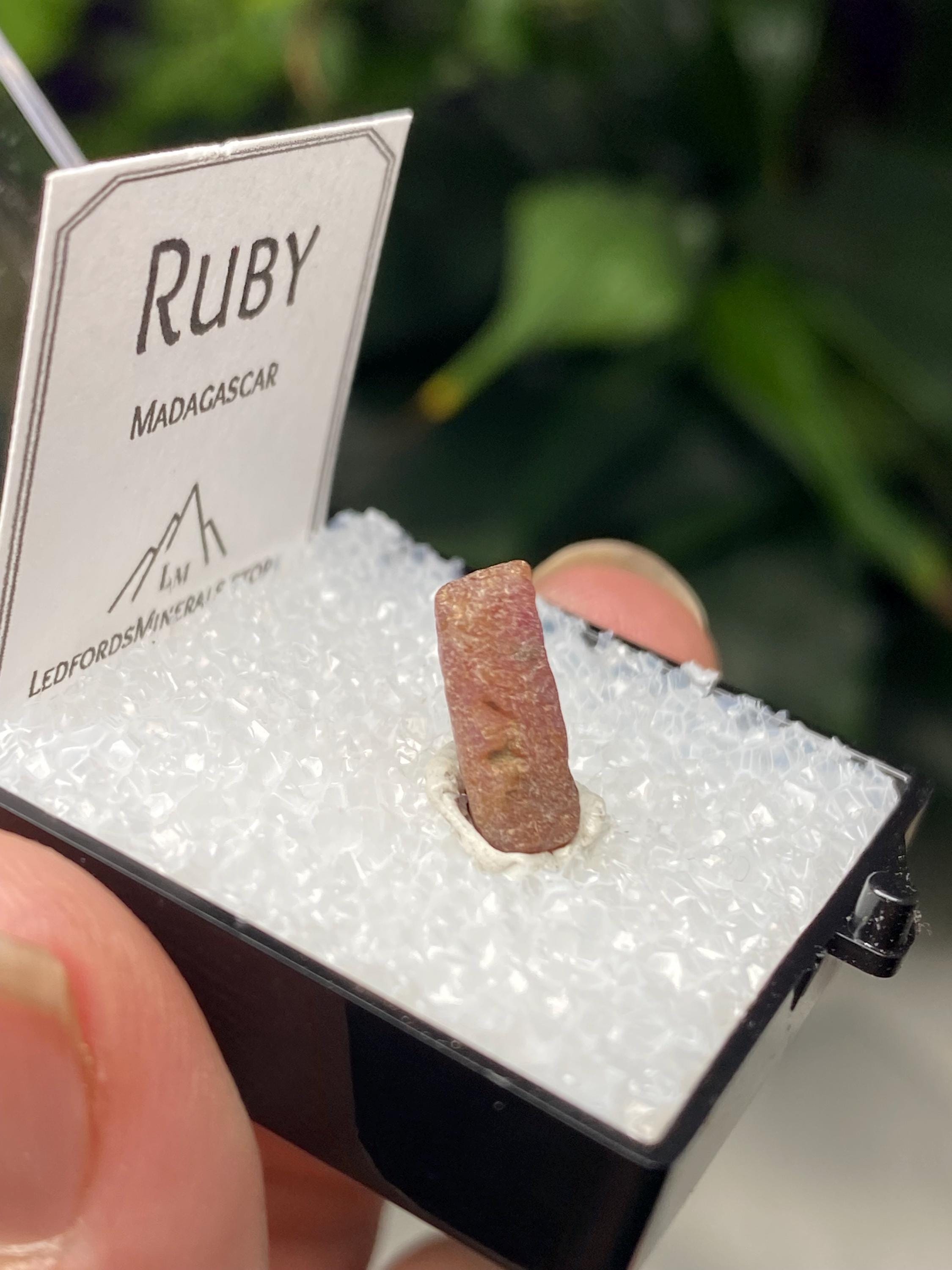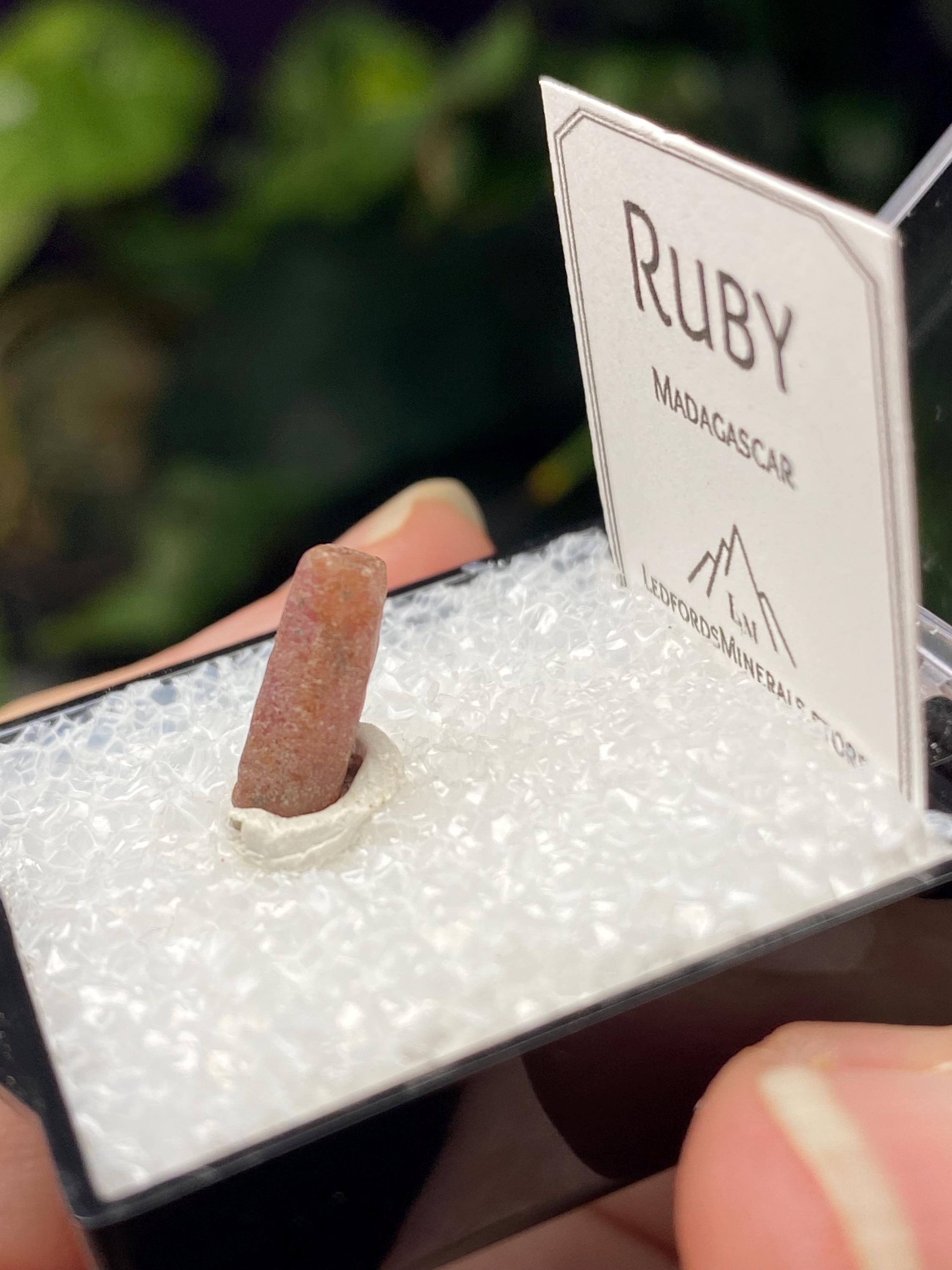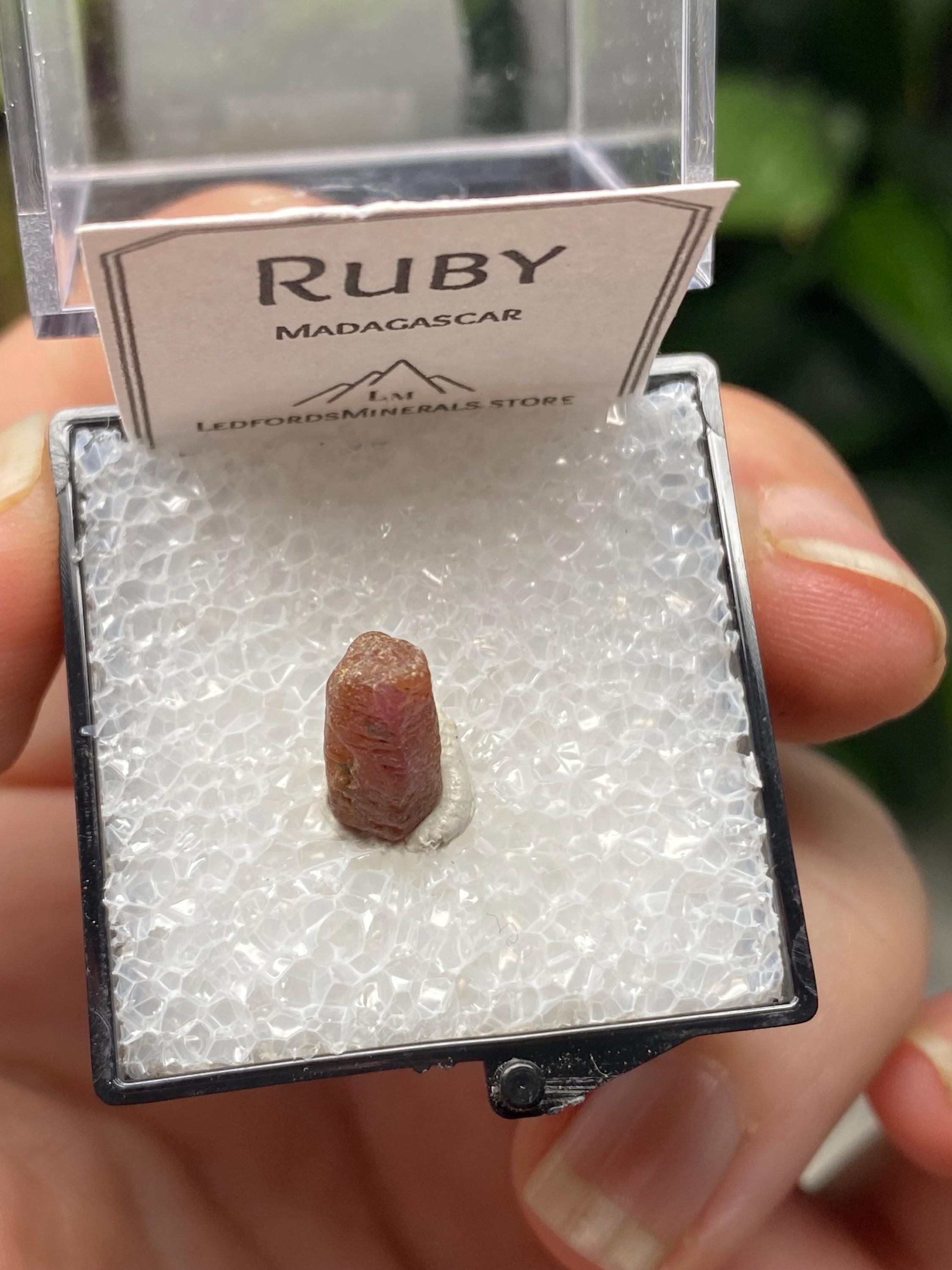Sweet Ruby Crystal from Madagascar. UV Reactive with great color and form. Comes with a mineral card.Comes in 1” Perky box..7g