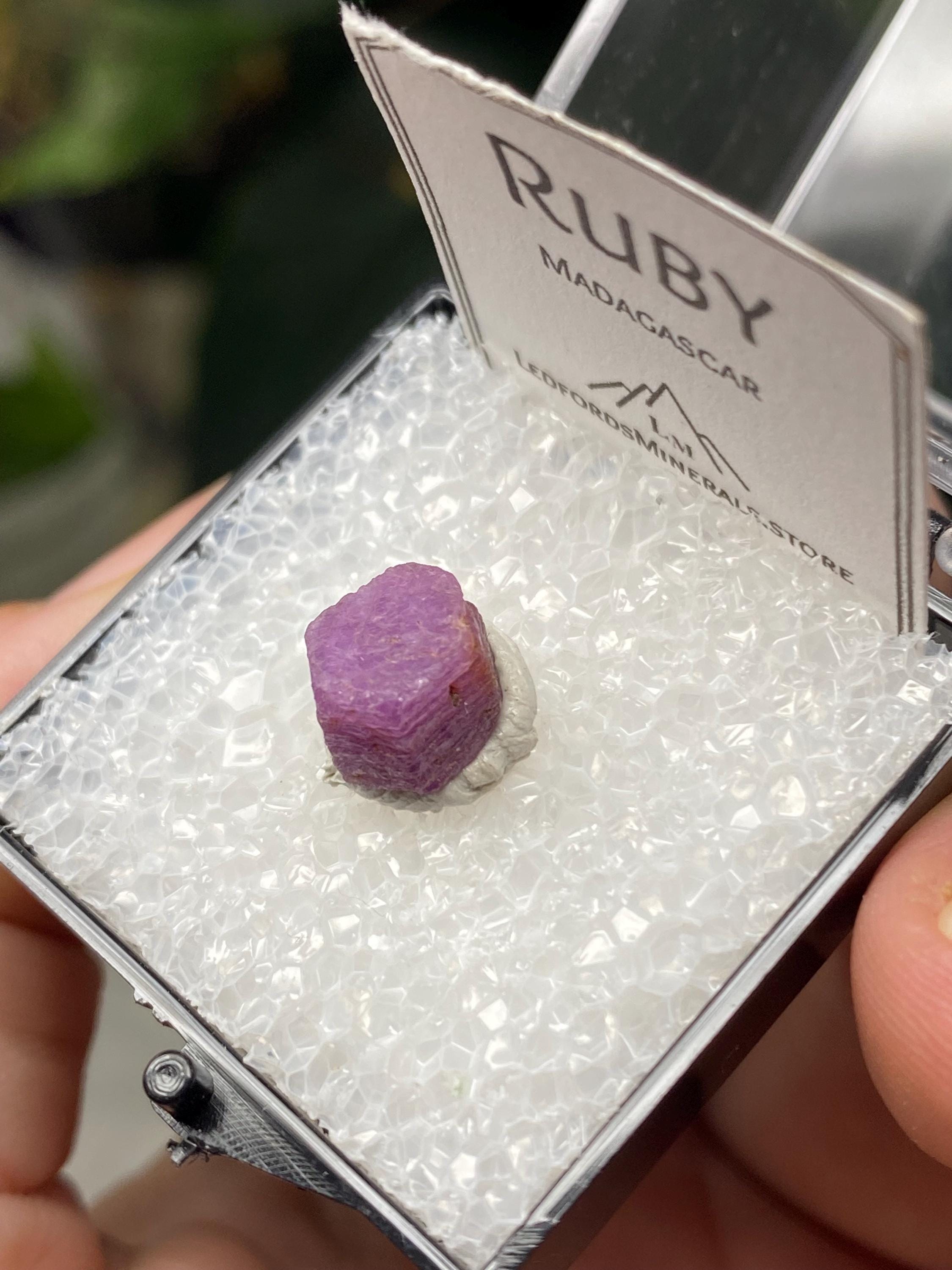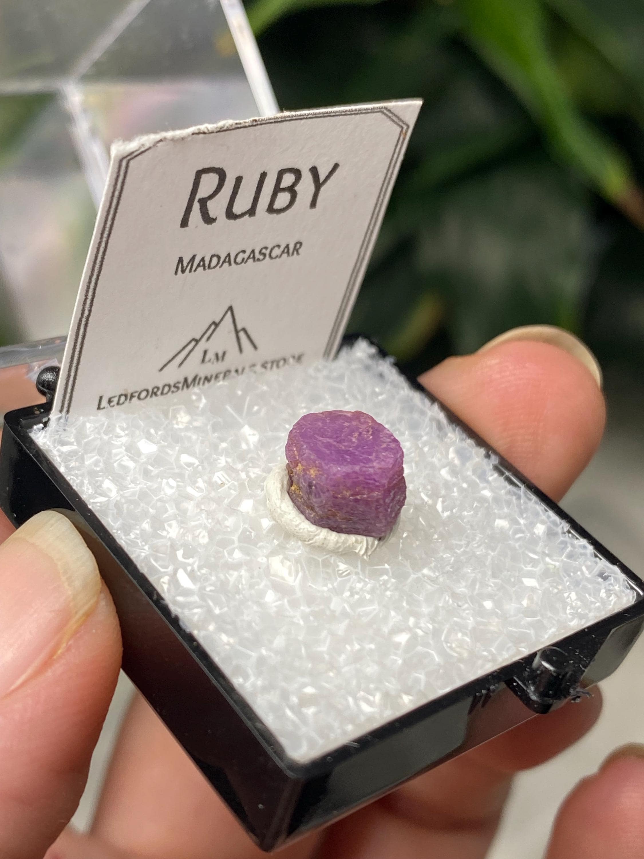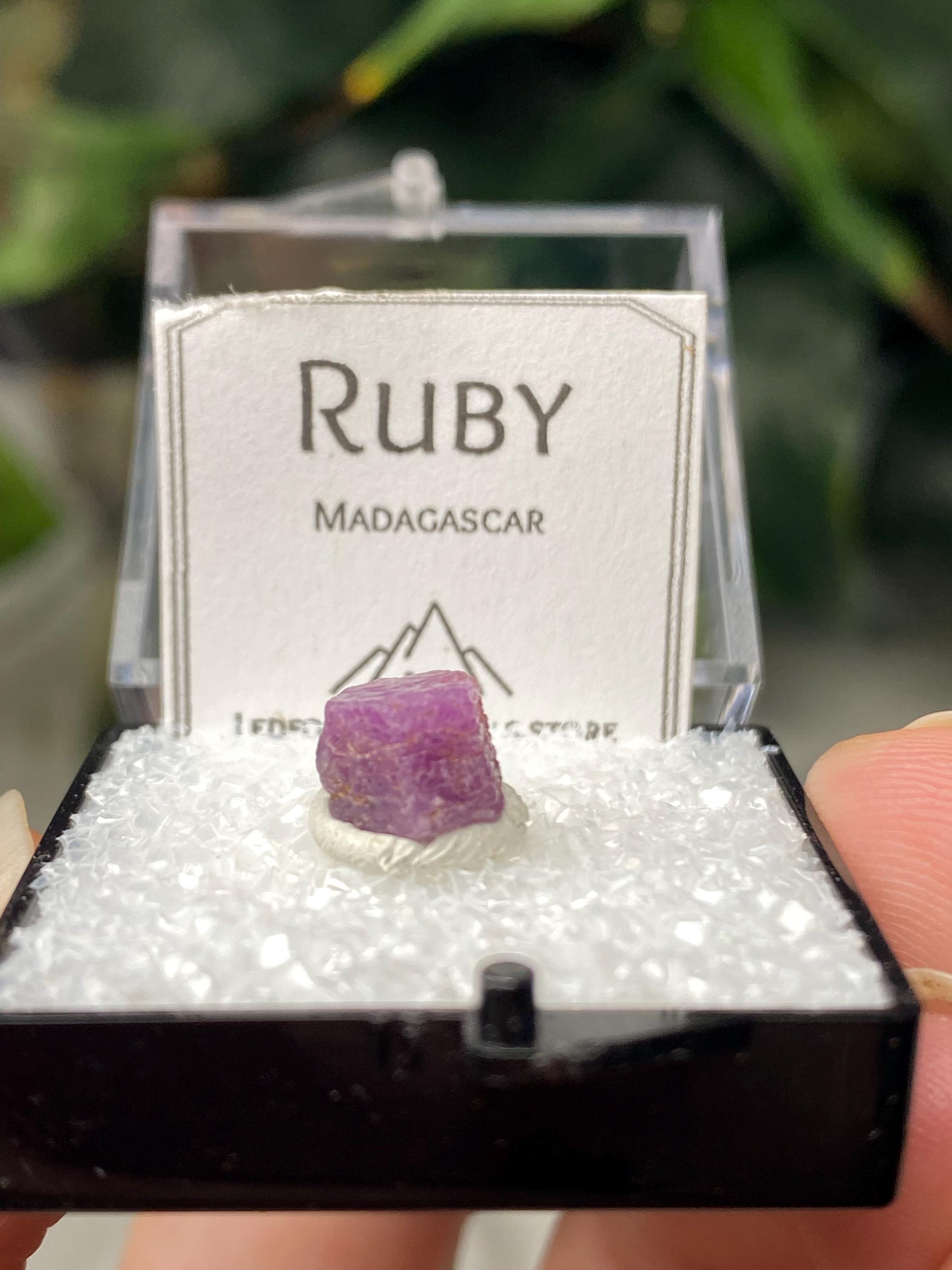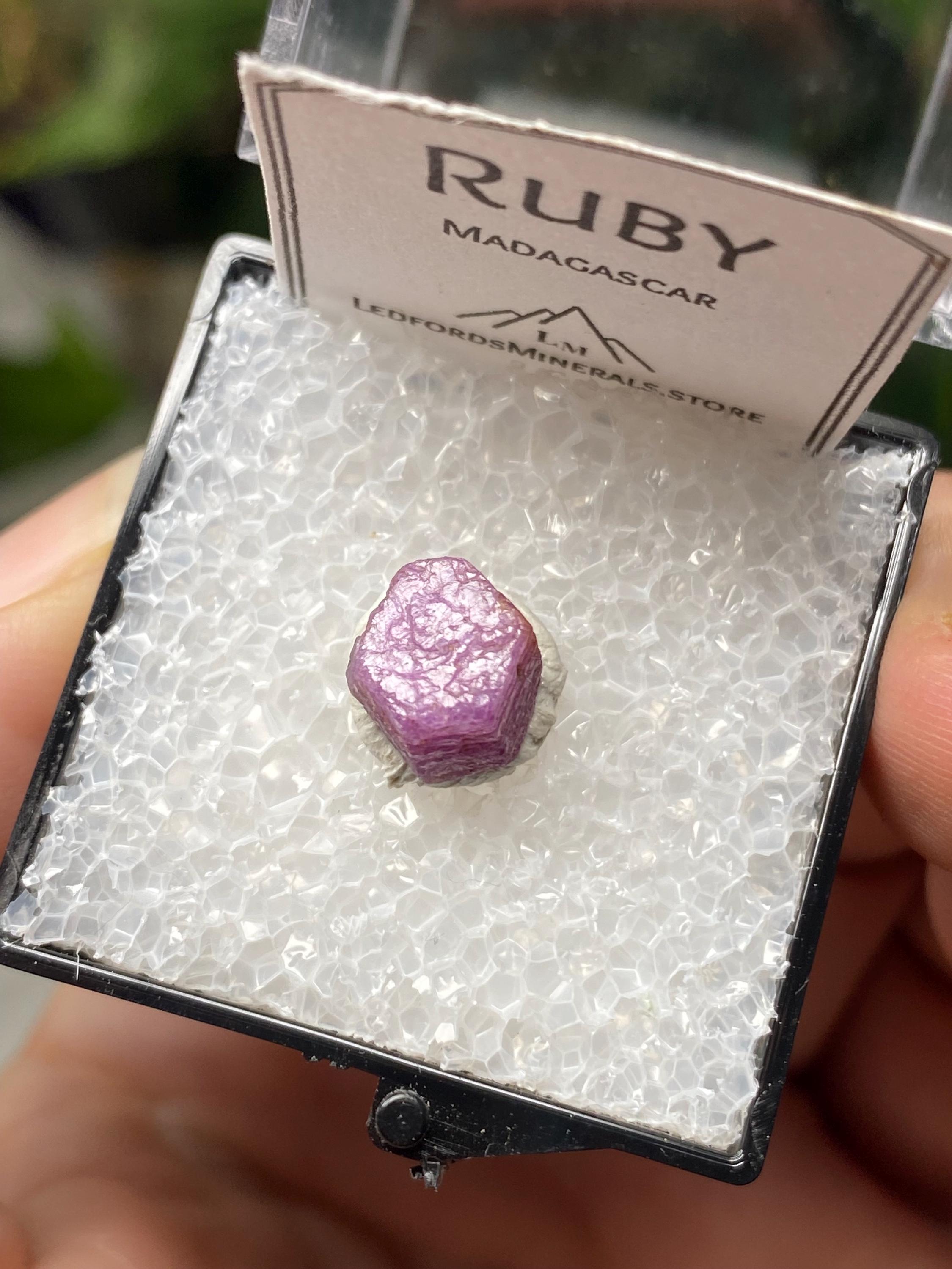 Sweet Ruby Crystal from Madagascar. UV Reactive with great color and form. Comes with a mineral card.Comes in 1” Perky box..9g