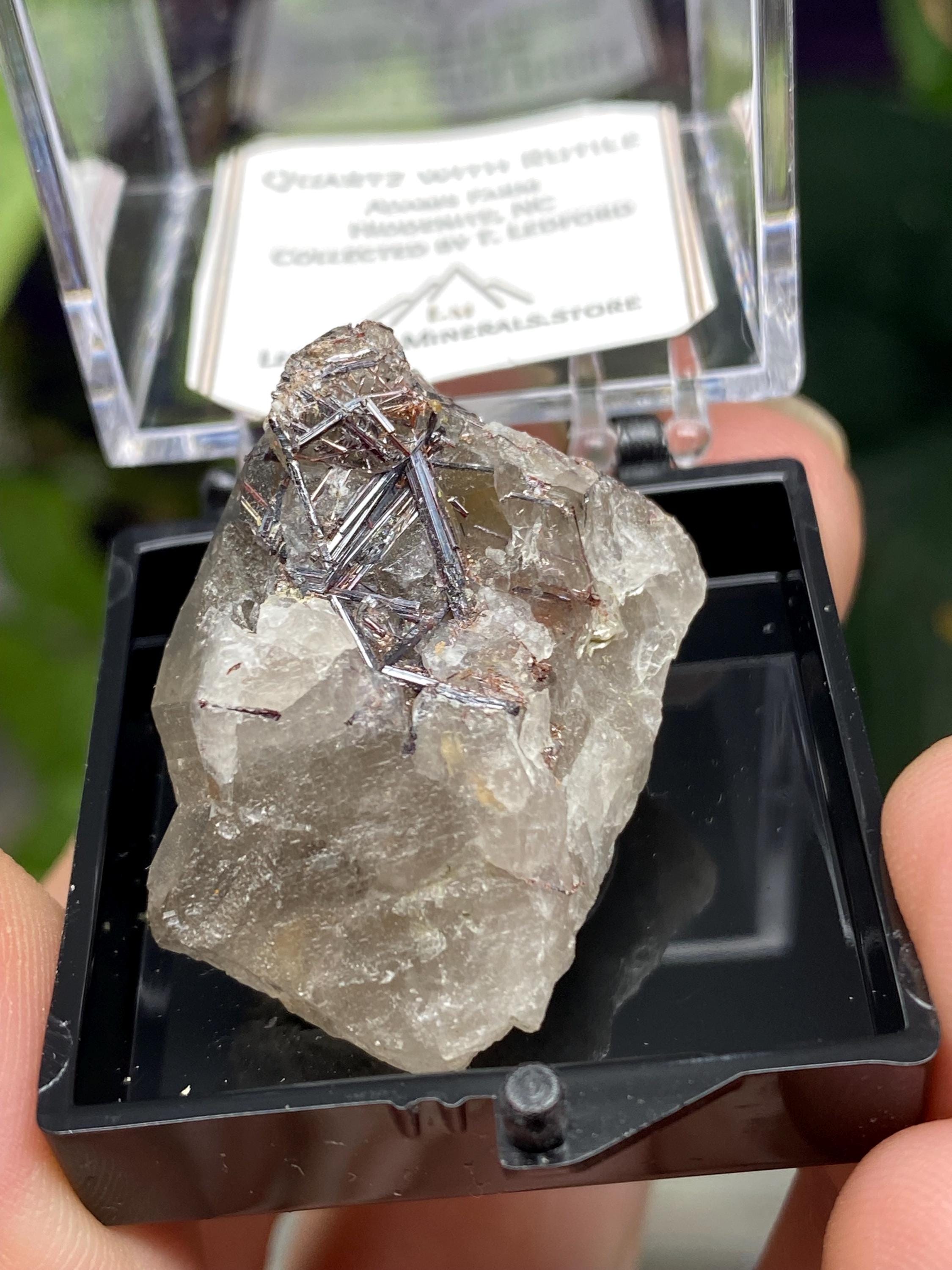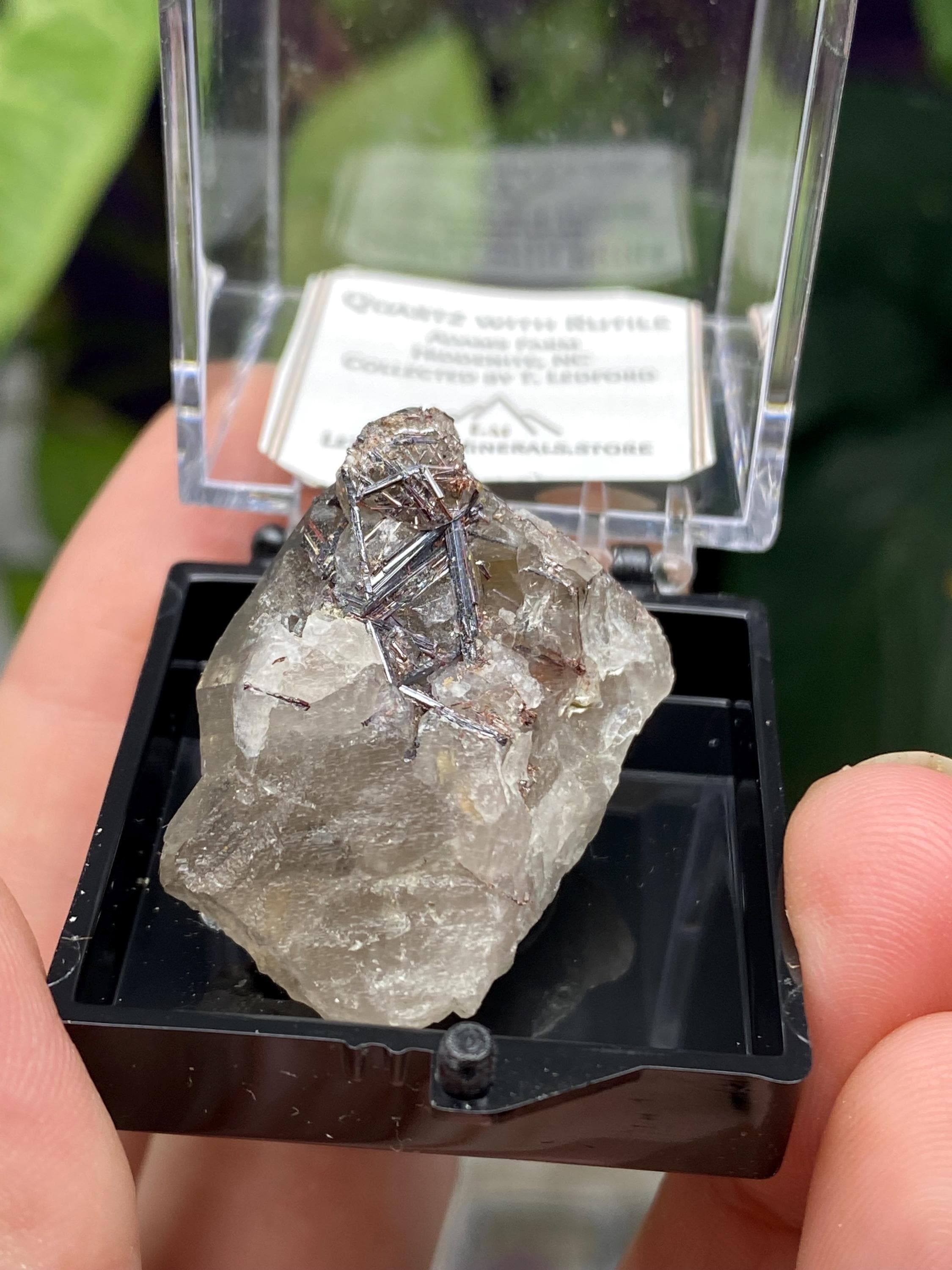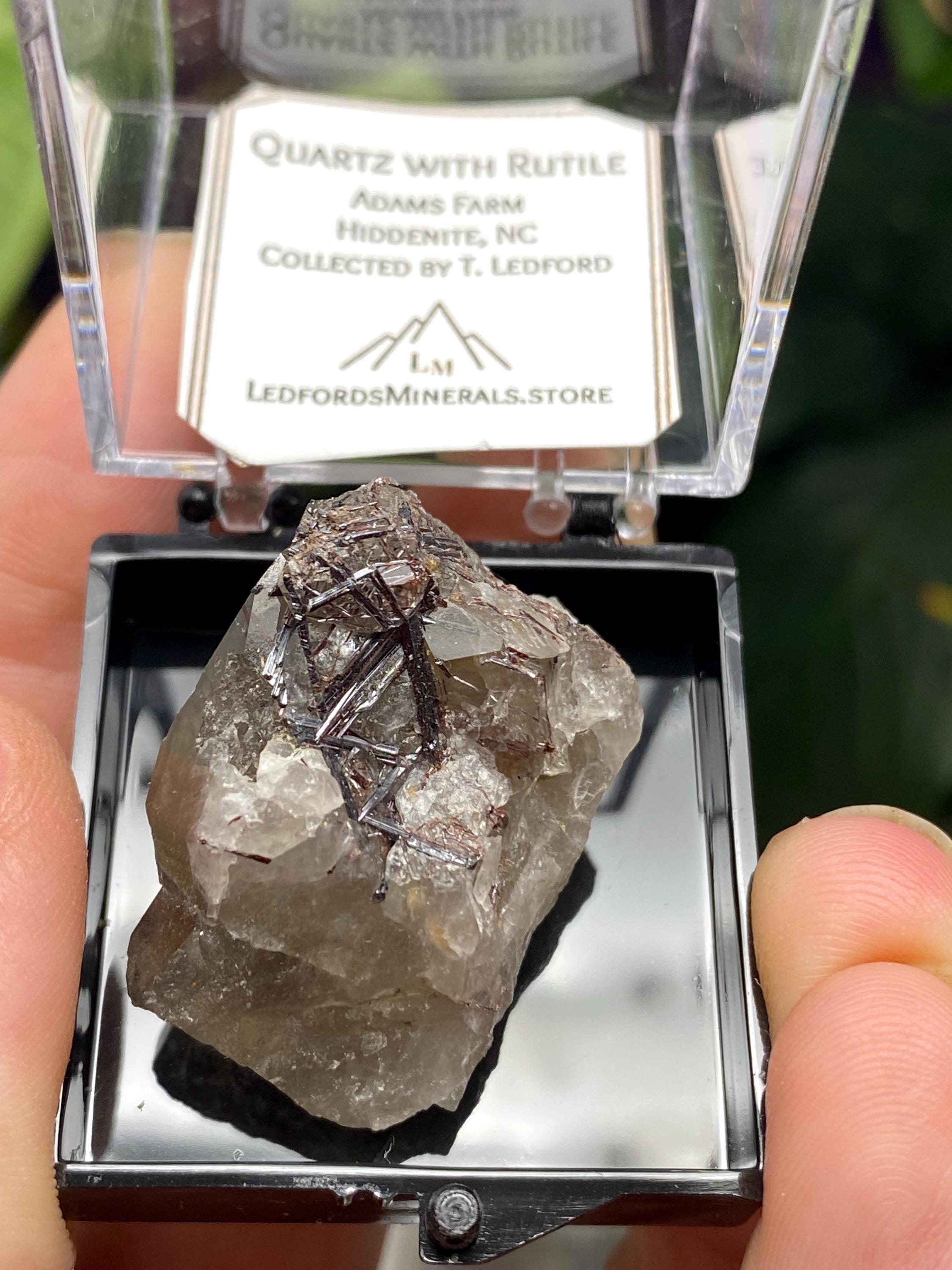 Quartz with Rutile Thumbnail from the North American Emerald Mine in Hiddenite NC. Collected by Terry Ledford and comes with a mineral card. Comes in a 1” perky box. Thumbnail size