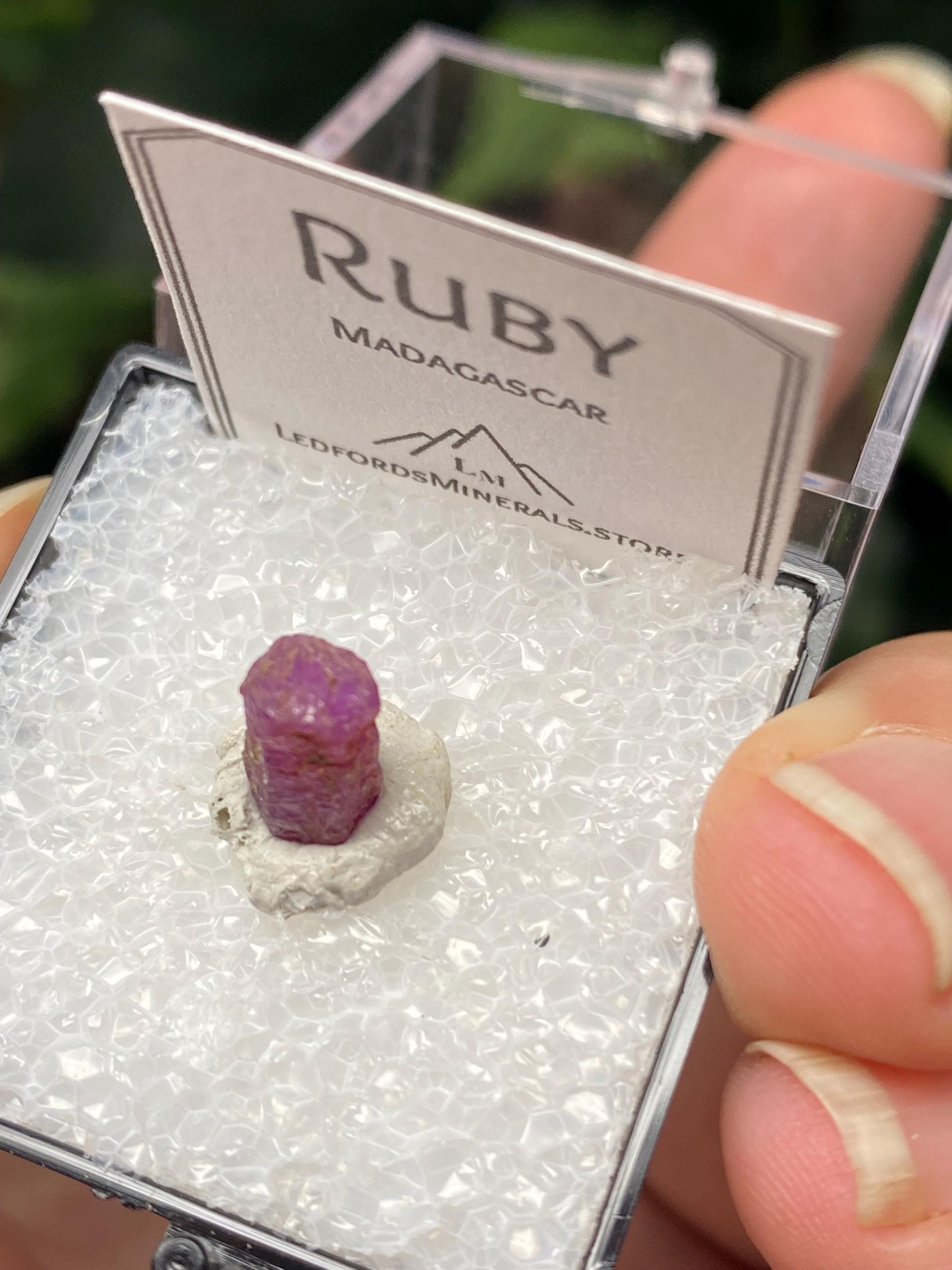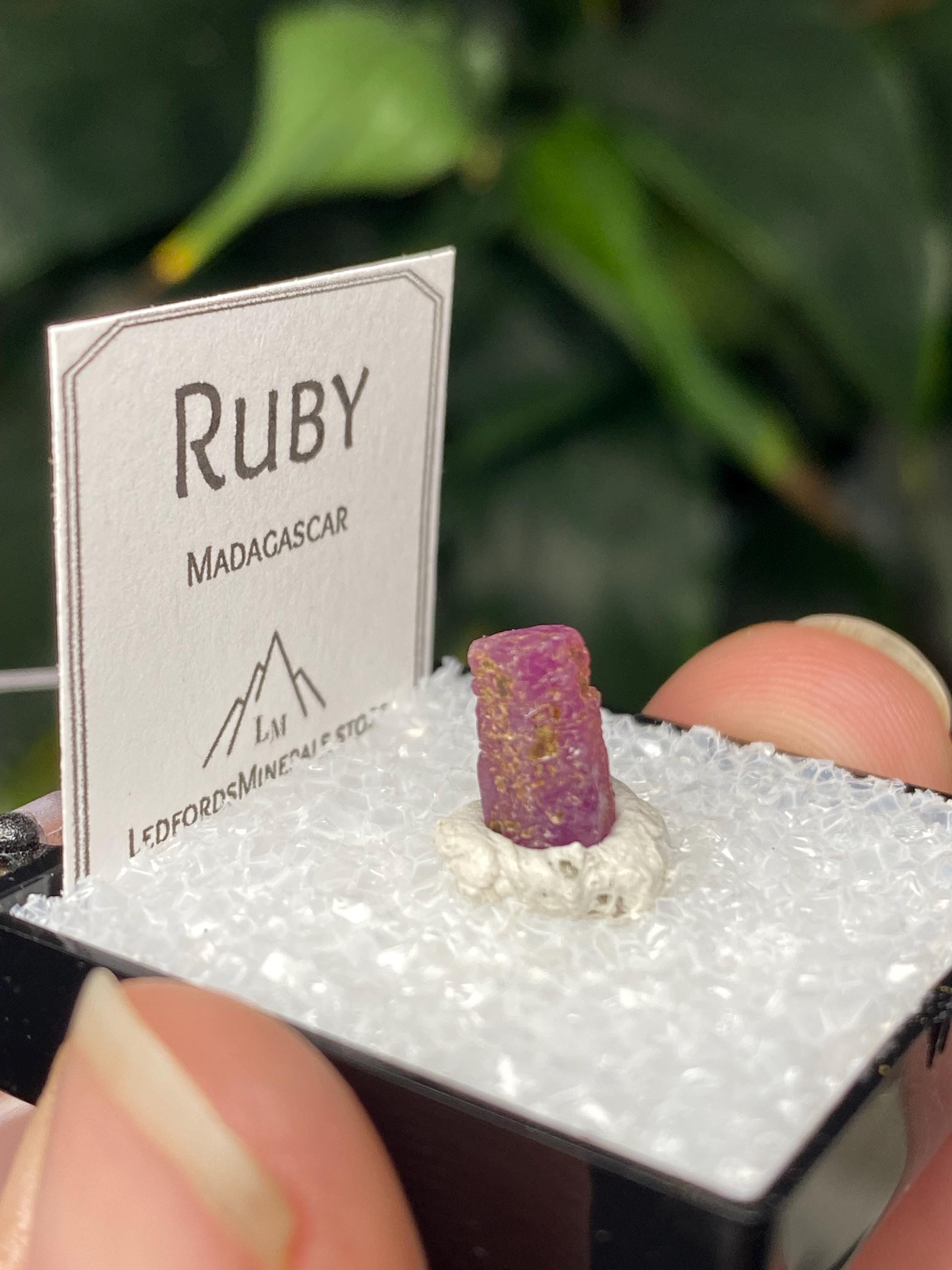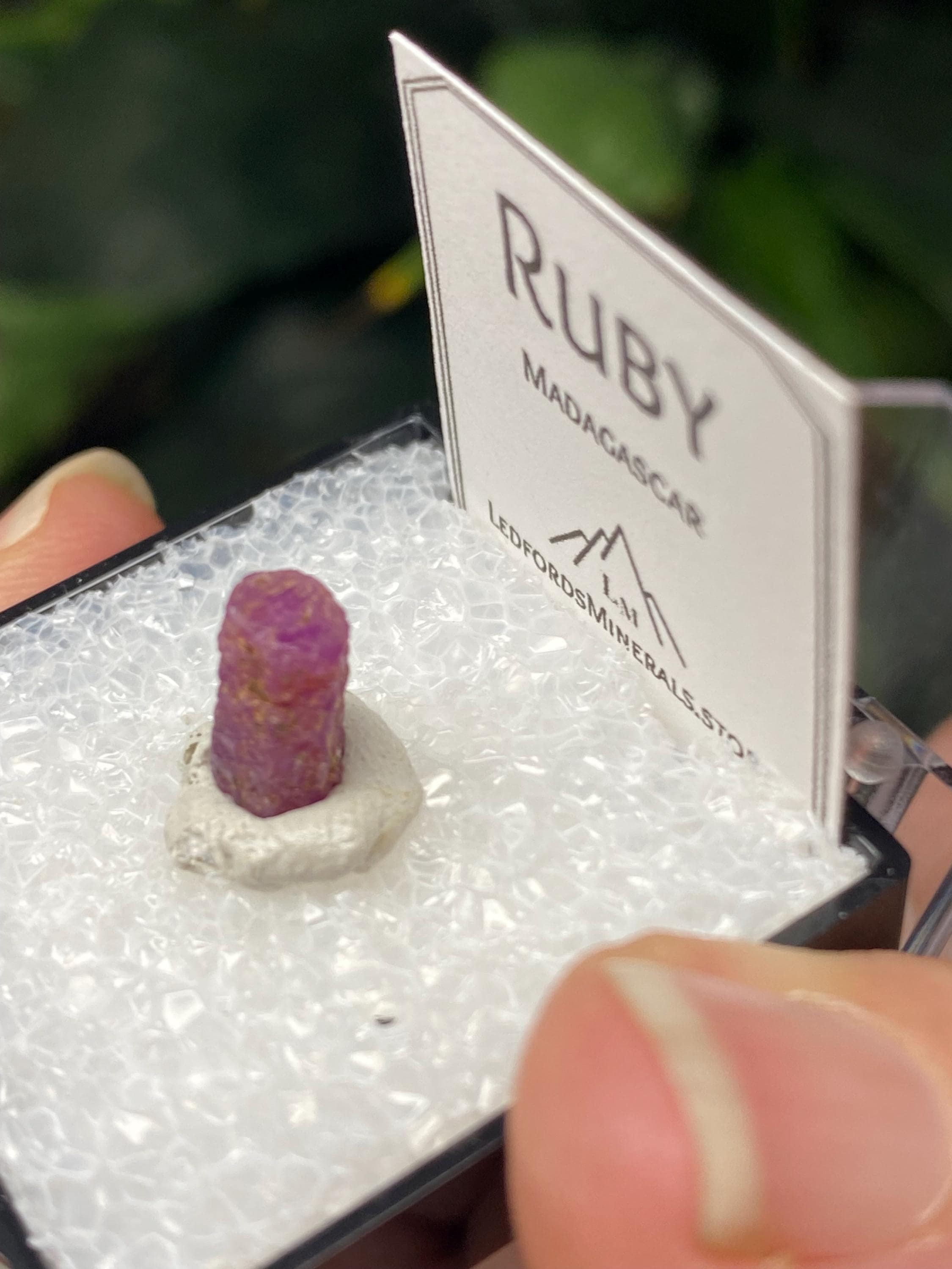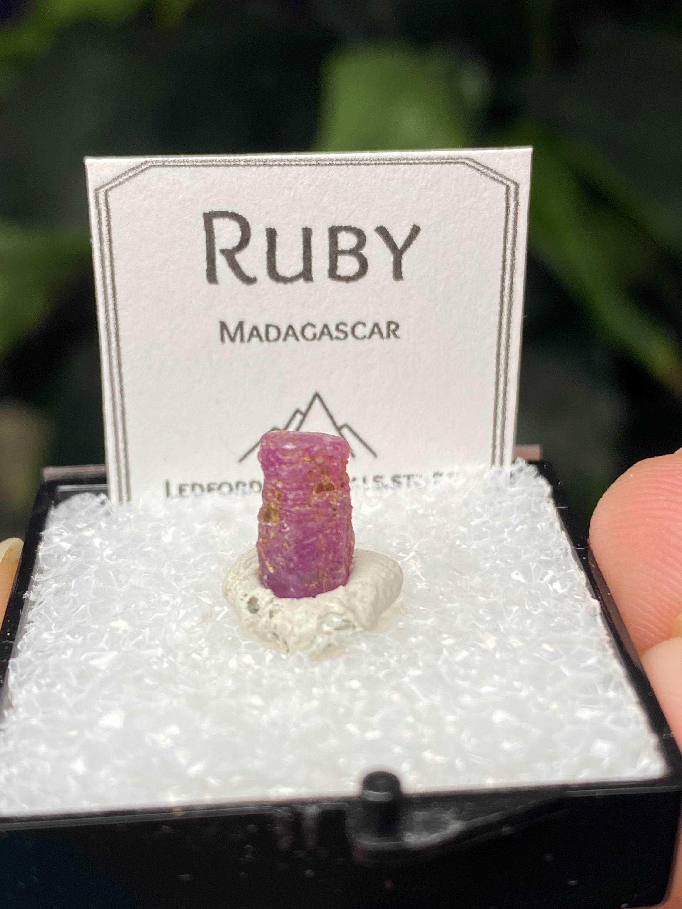Sweet Ruby Crystal from Madagascar. UV Reactive with great color and form. Comes with a mineral card.Comes in 1” Perky box..5g