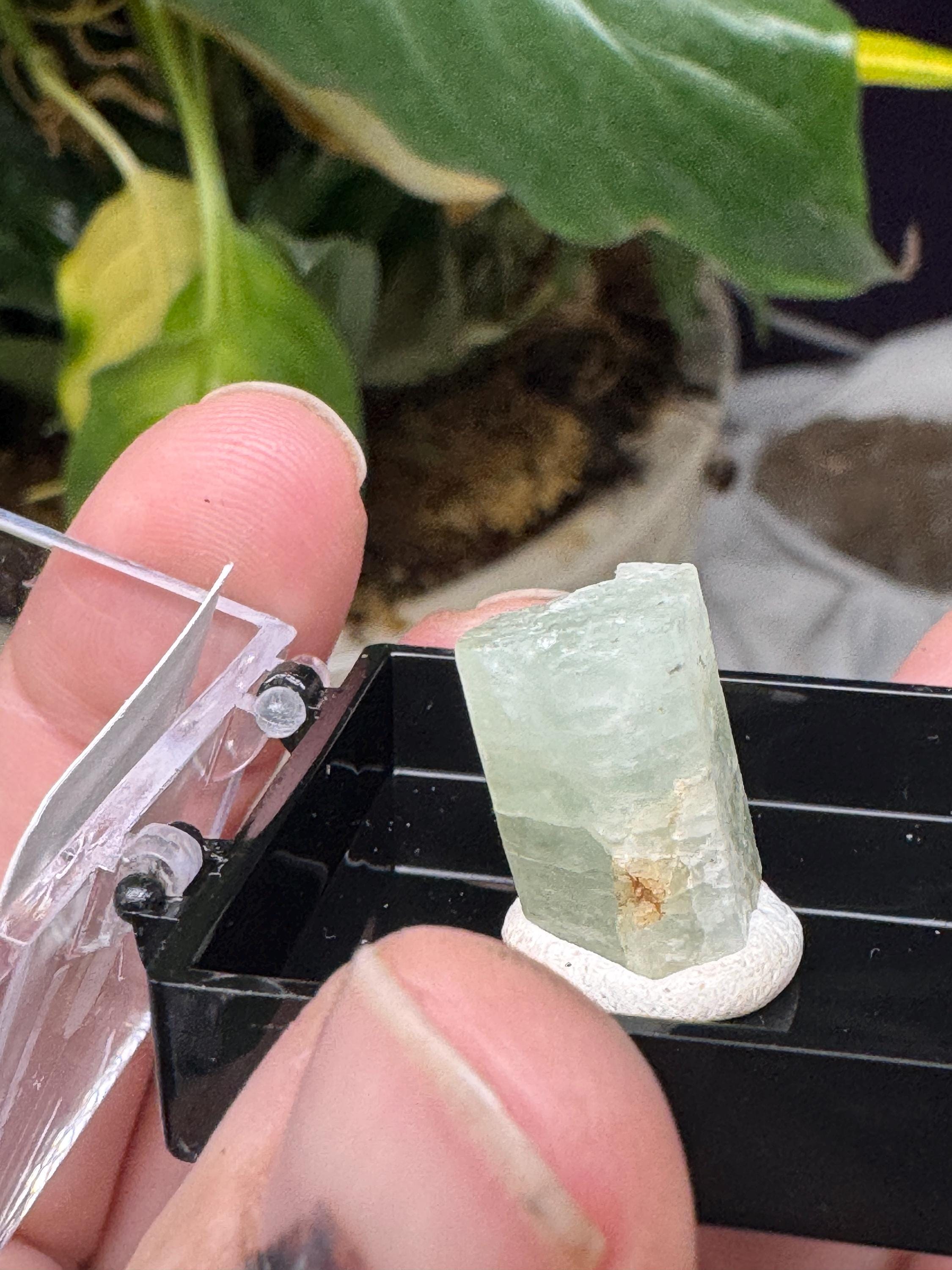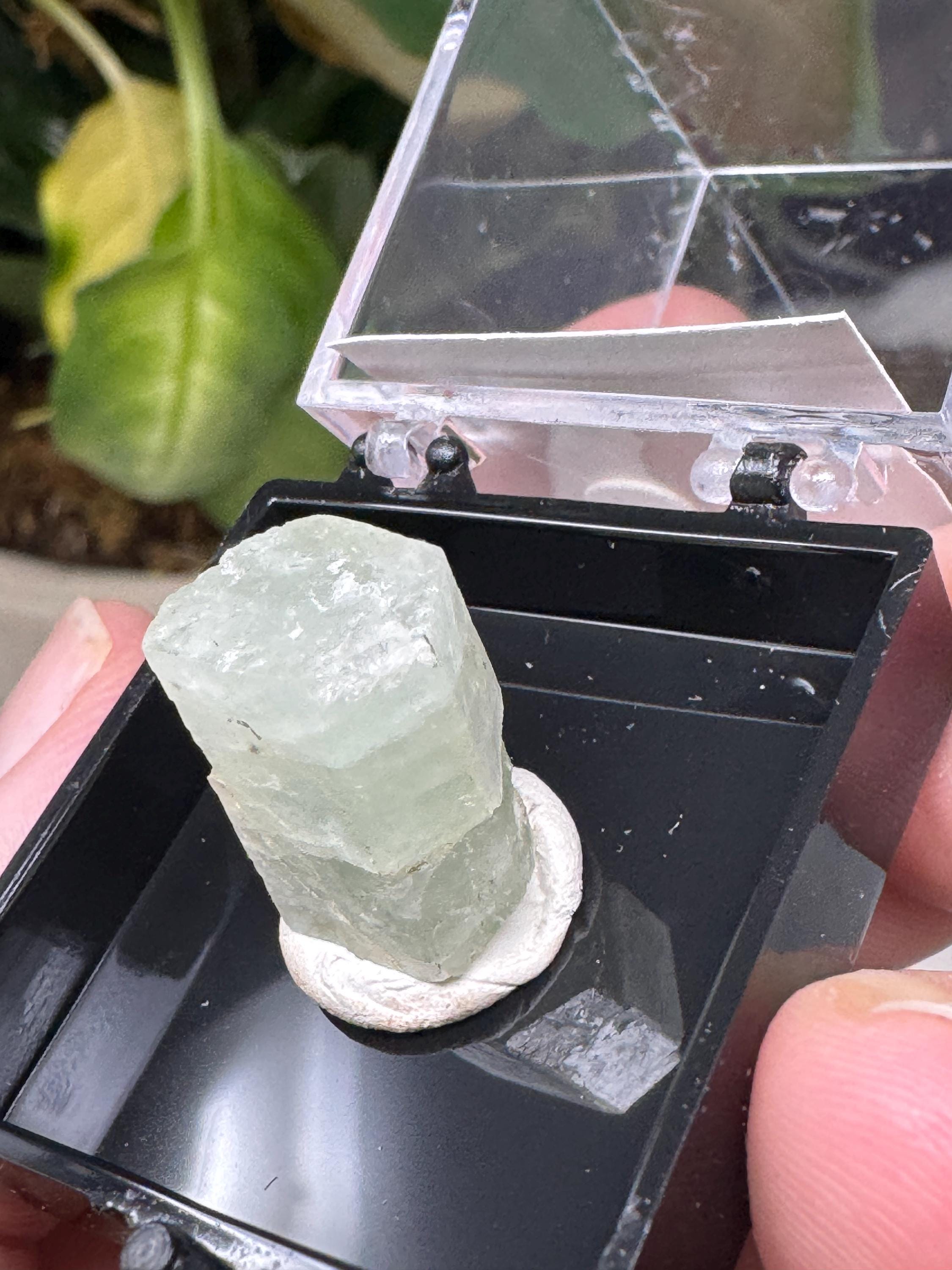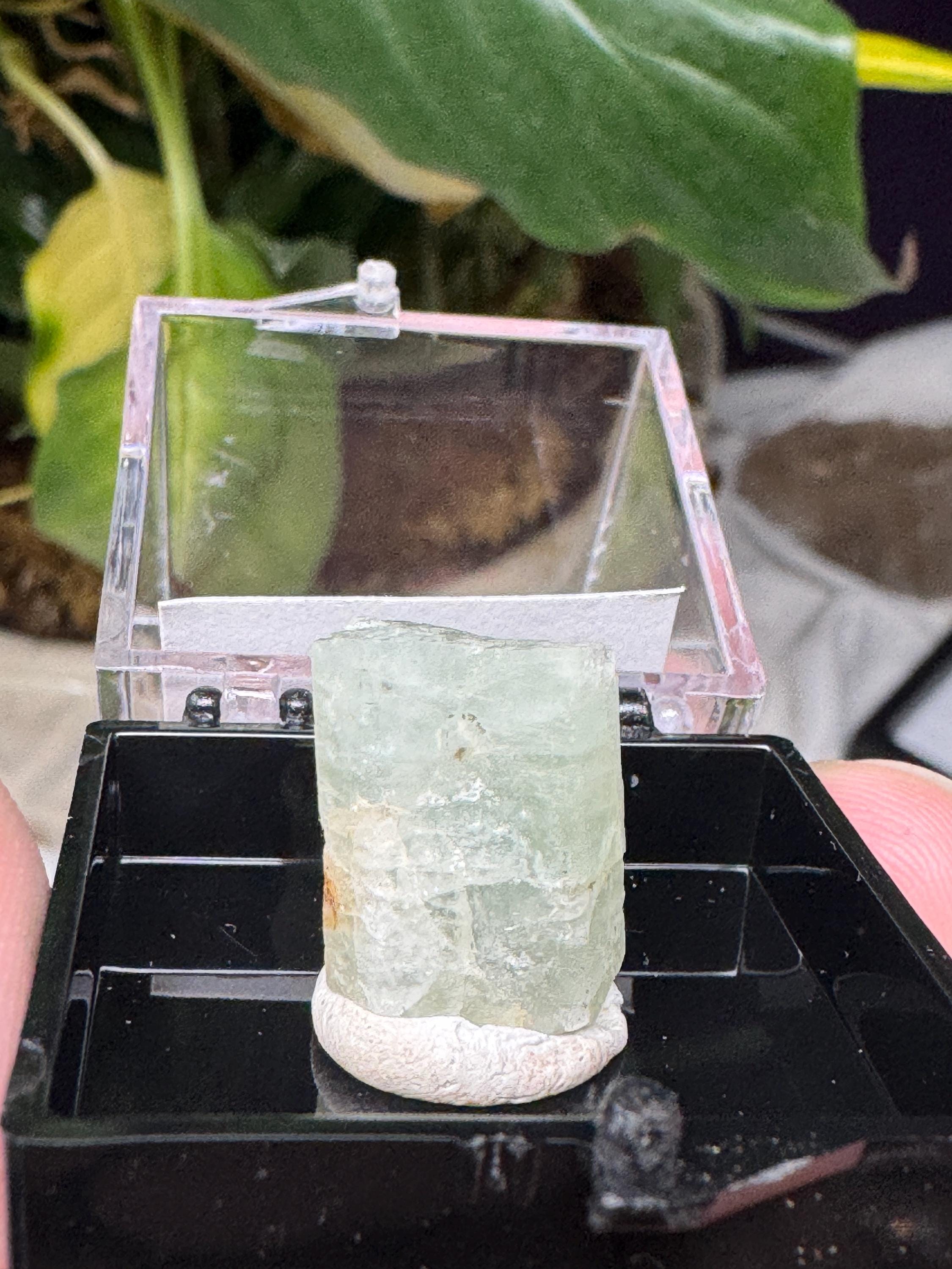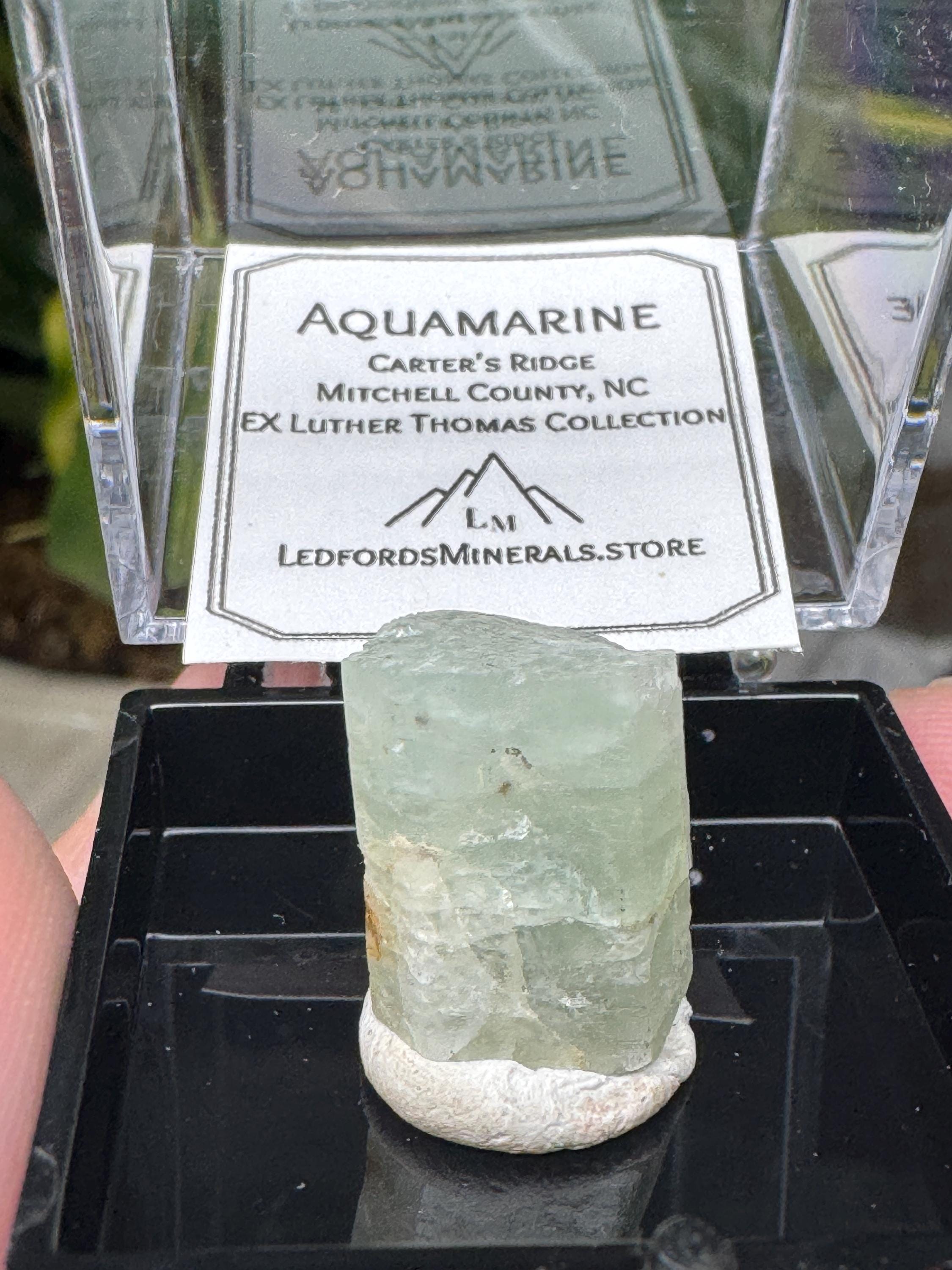 Beryl var Aquamarine Crystal from Carter's Ridge, Spruce Pine, NC. Now closed location. Old Find. This location is known for Beryl that will cats eye when cut. From the Luther Thomas Collection and Comes with a mineral card.