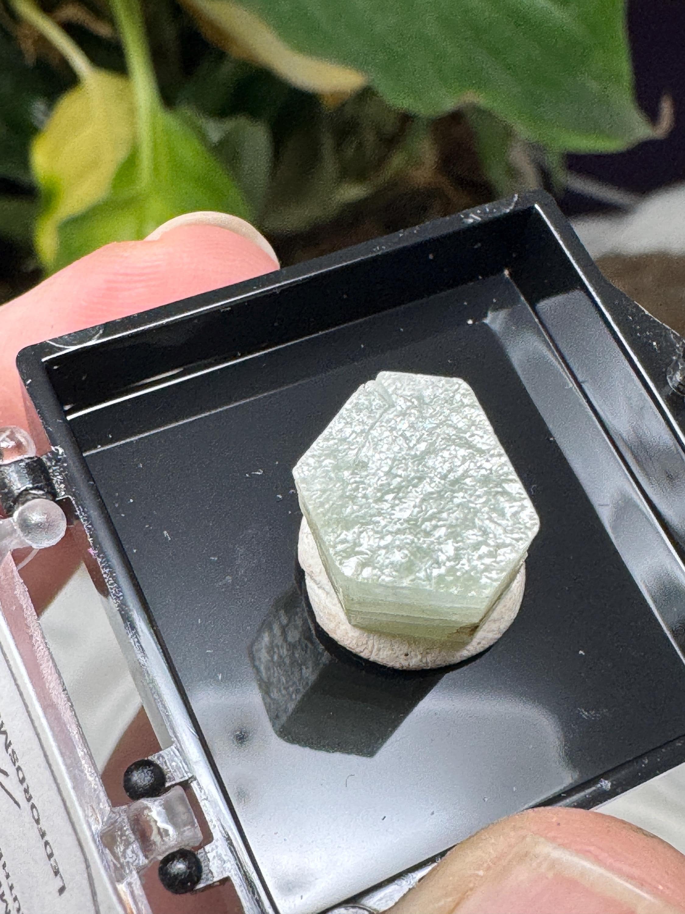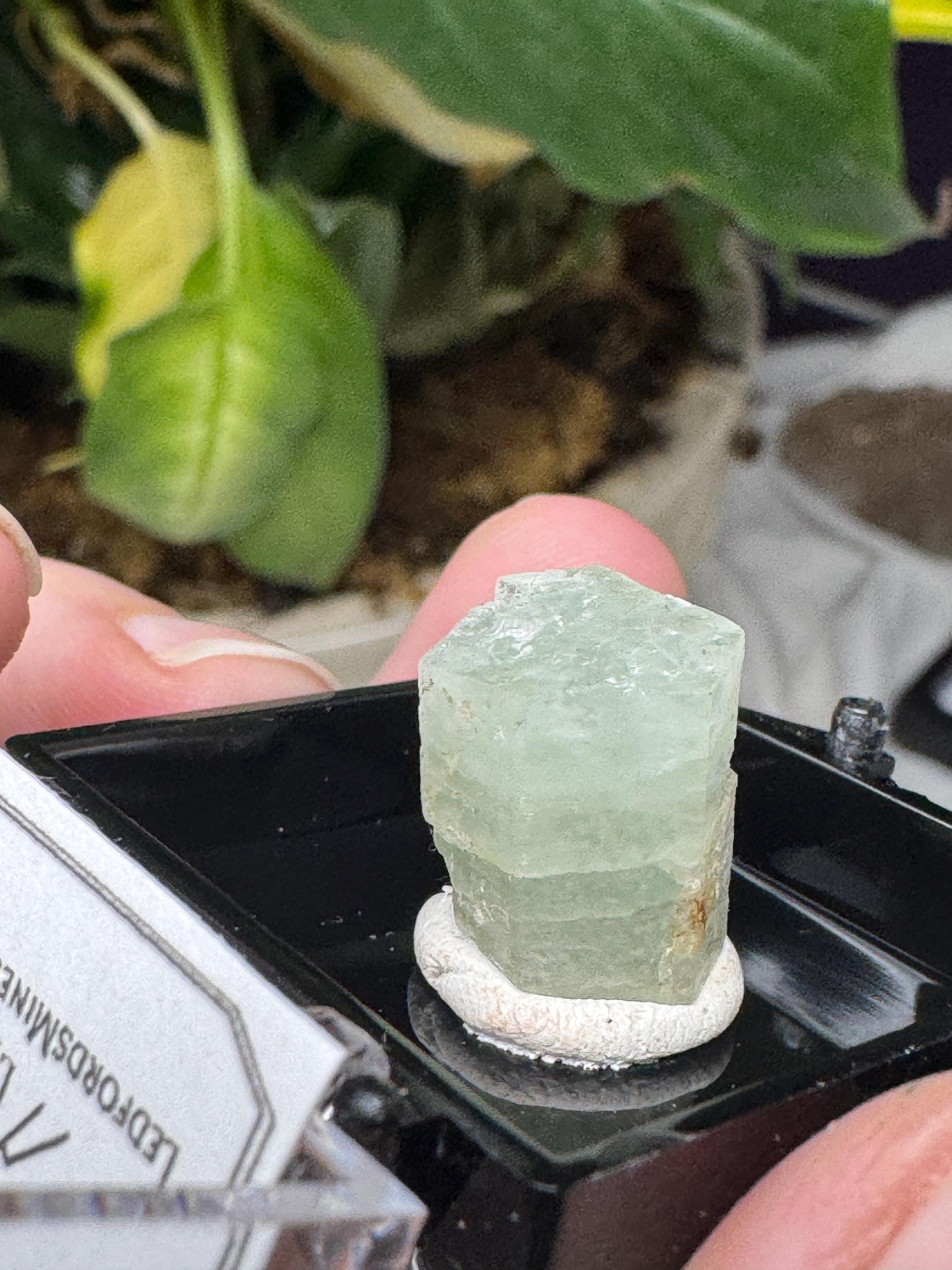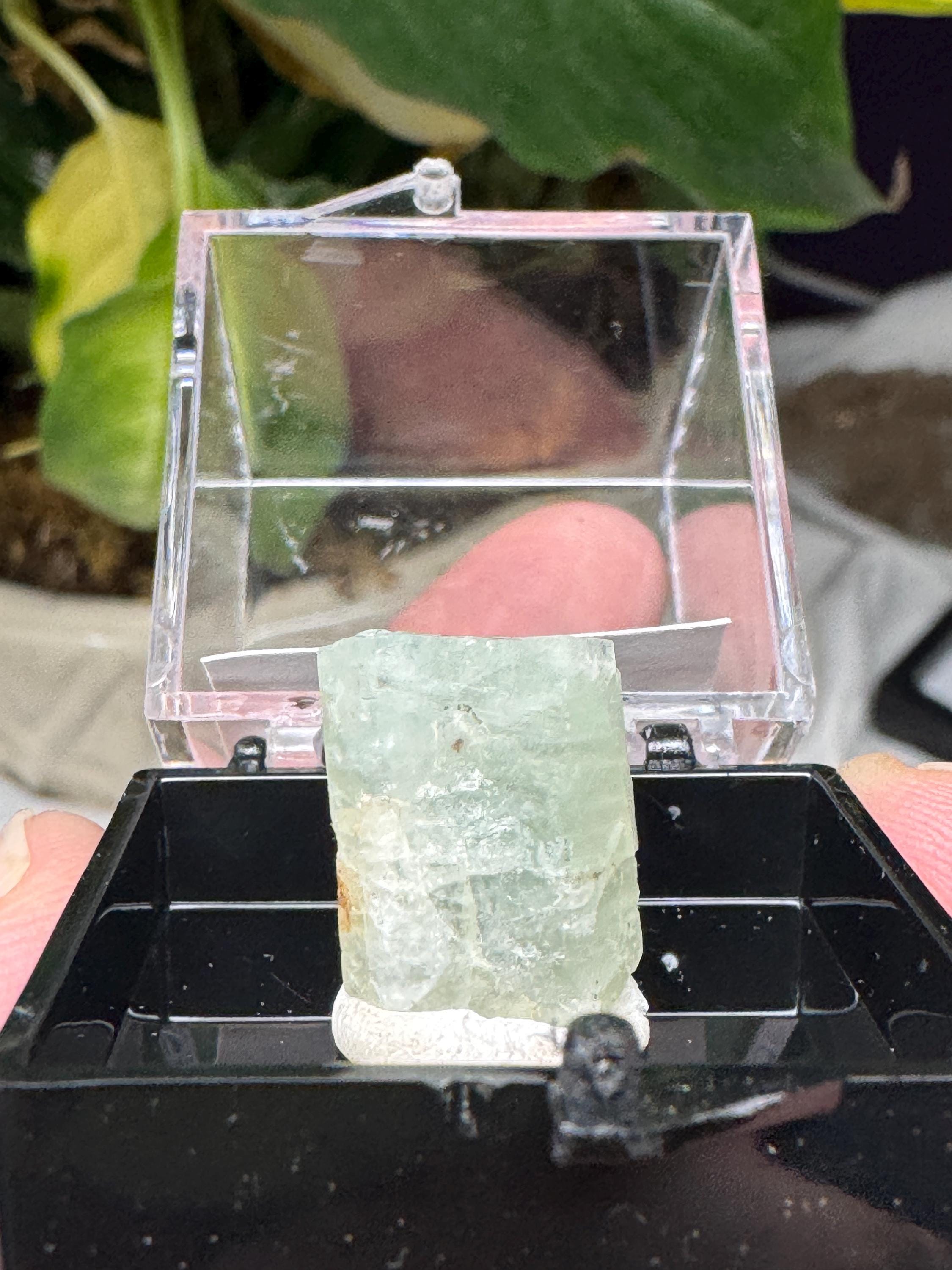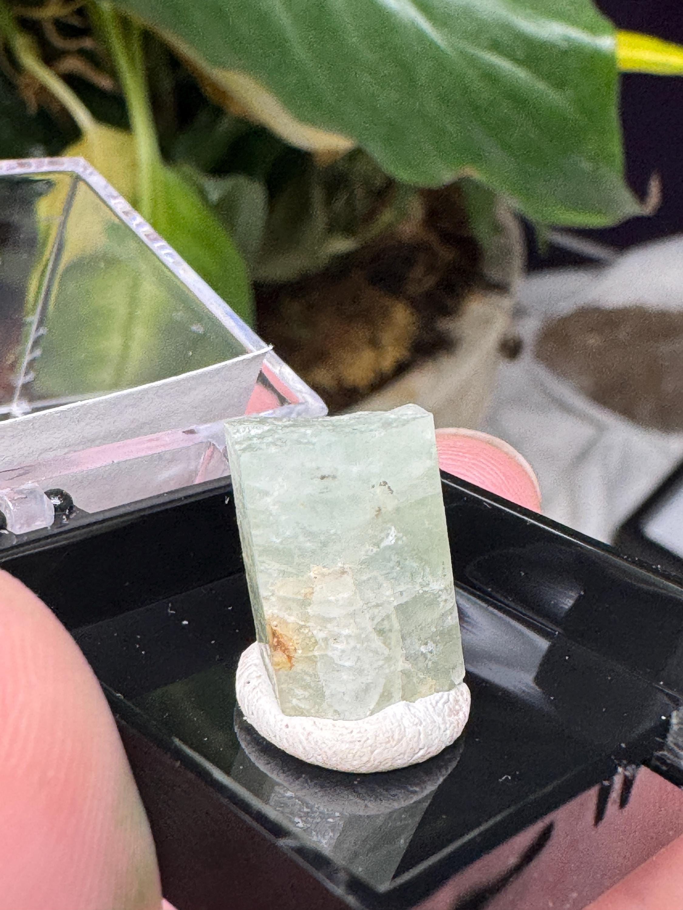 Beryl var Aquamarine Crystal from Carter's Ridge, Spruce Pine, NC. Now closed location. Old Find. This location is known for Beryl that will cats eye when cut. From the Luther Thomas Collection and Comes with a mineral card.