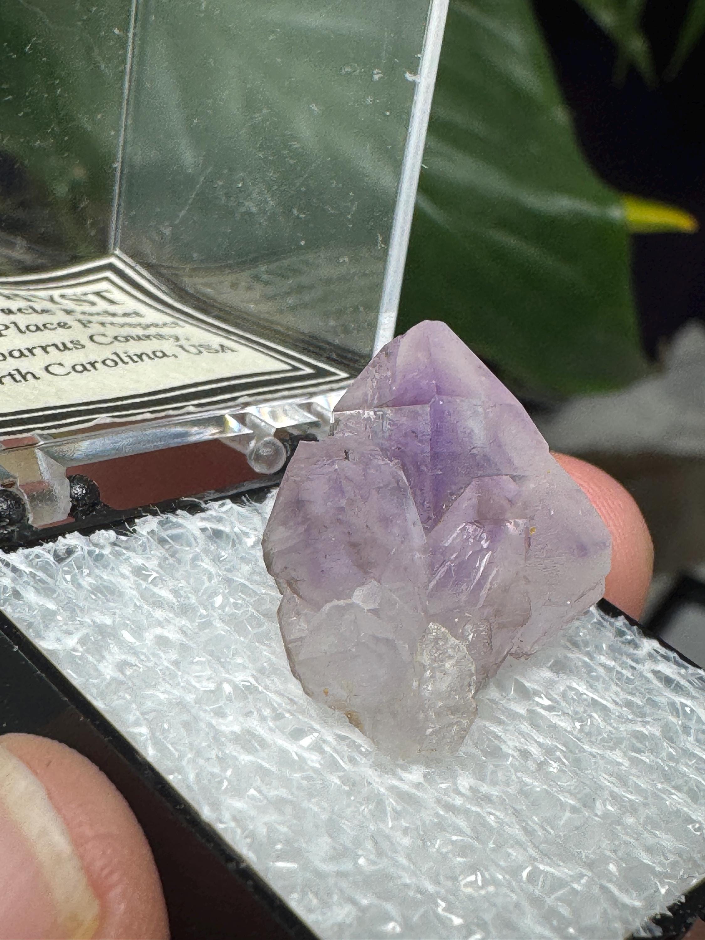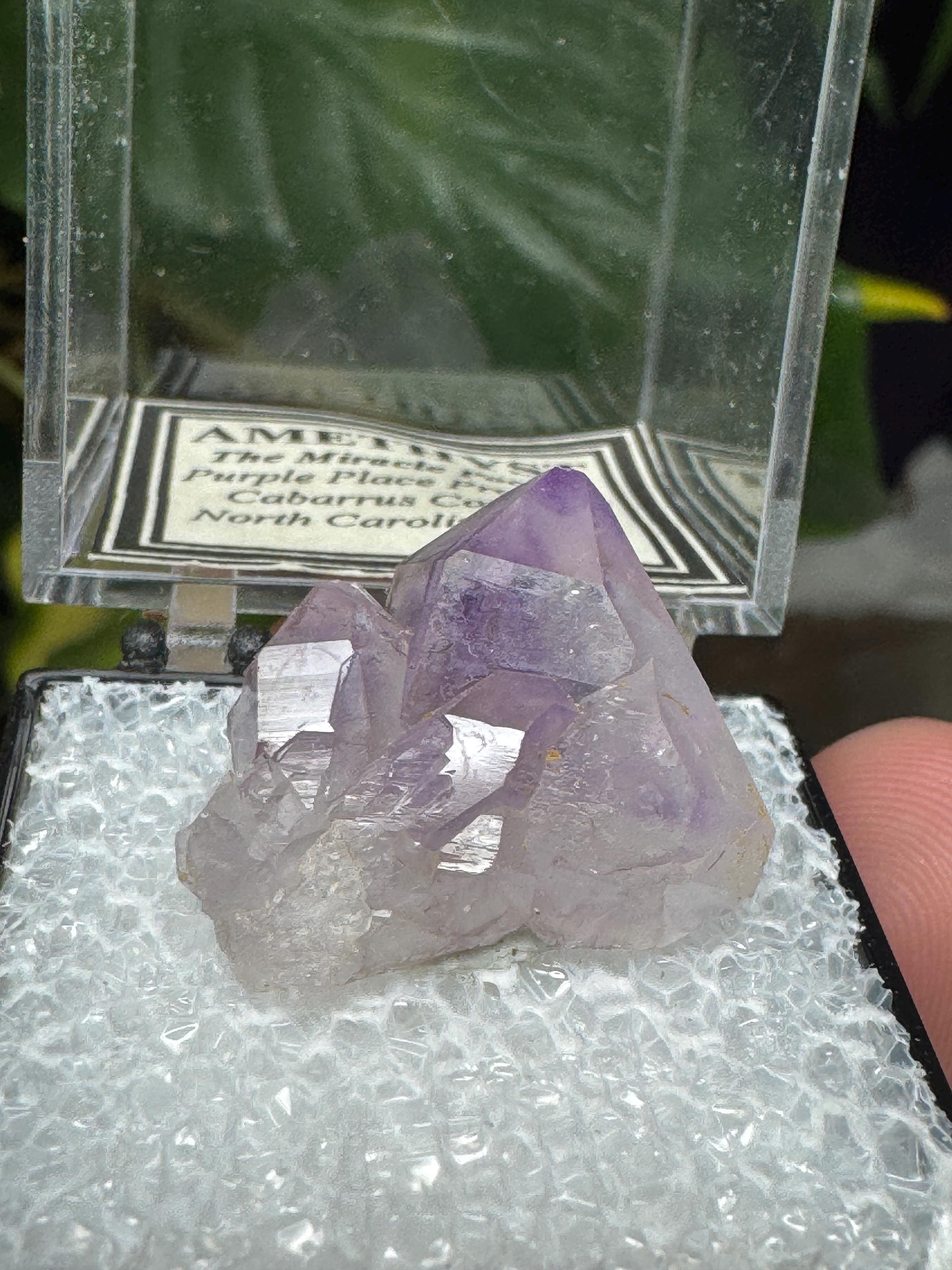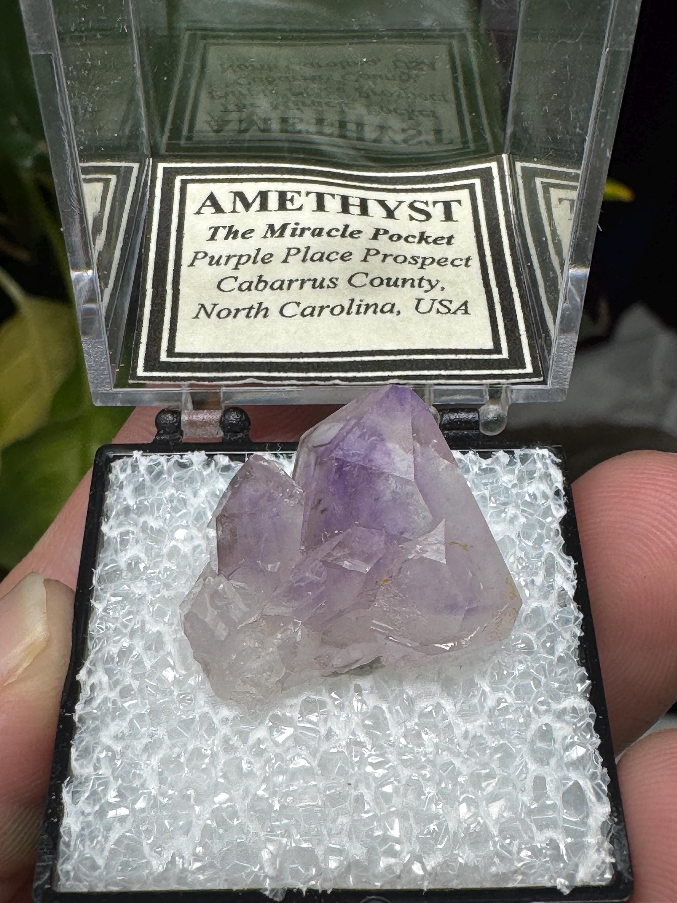 Amethyst Thumbnail from The Miracle Pocket at Purple Place Prospect in Cabarrus County, North Carolina. Beautiful amethyst with luster and lilac color. Fits in a Thumbnail 1” perky box.