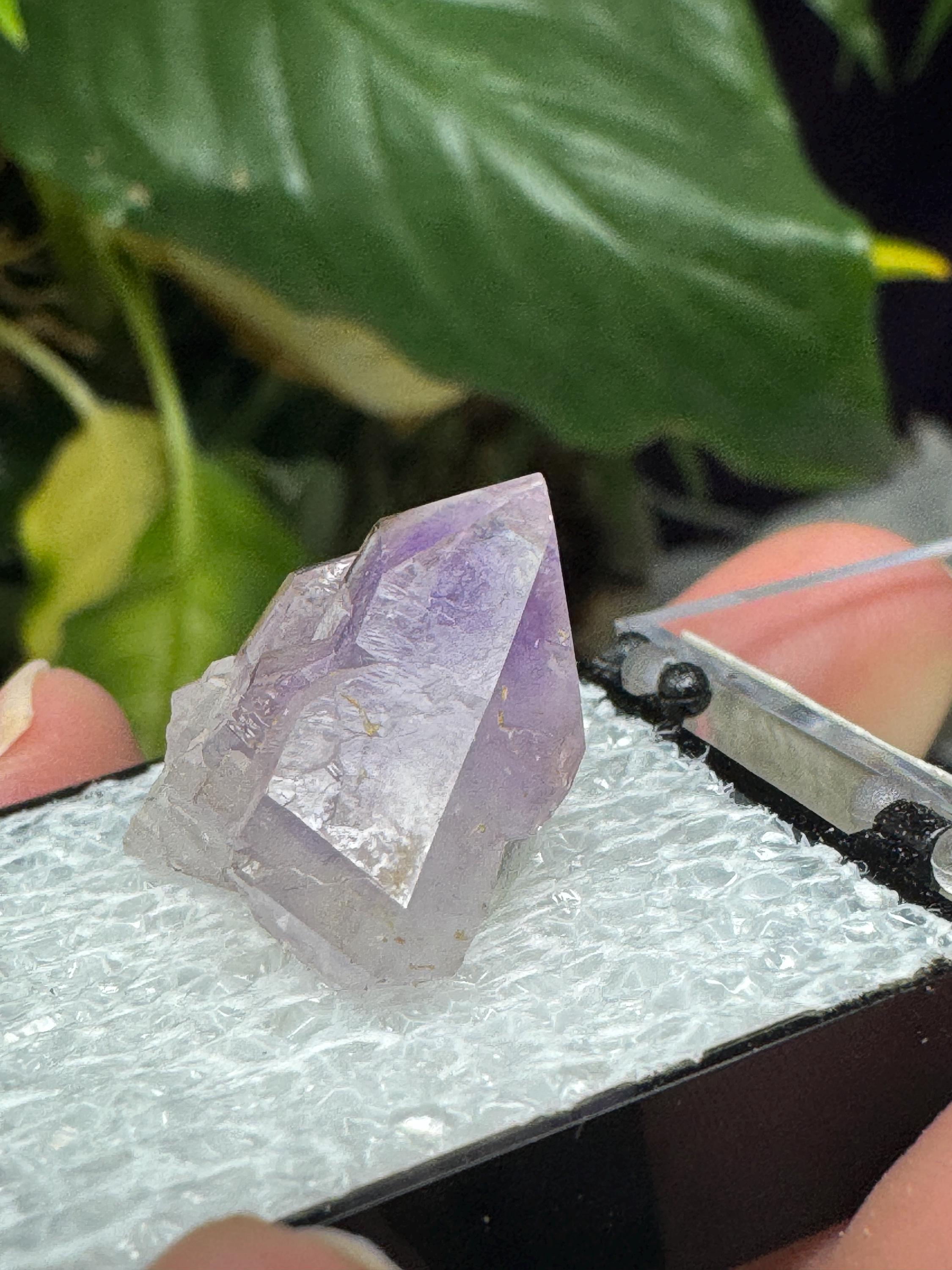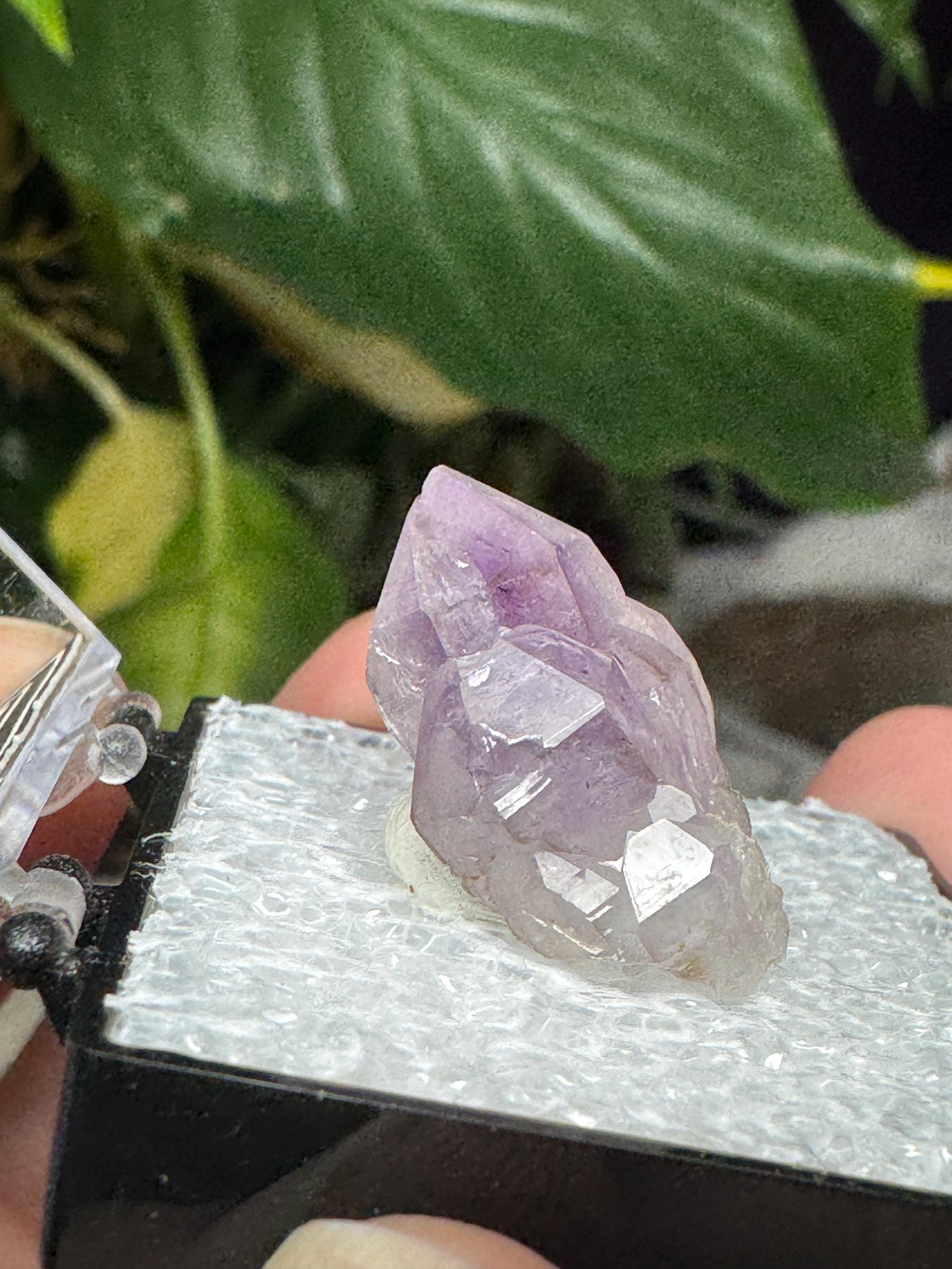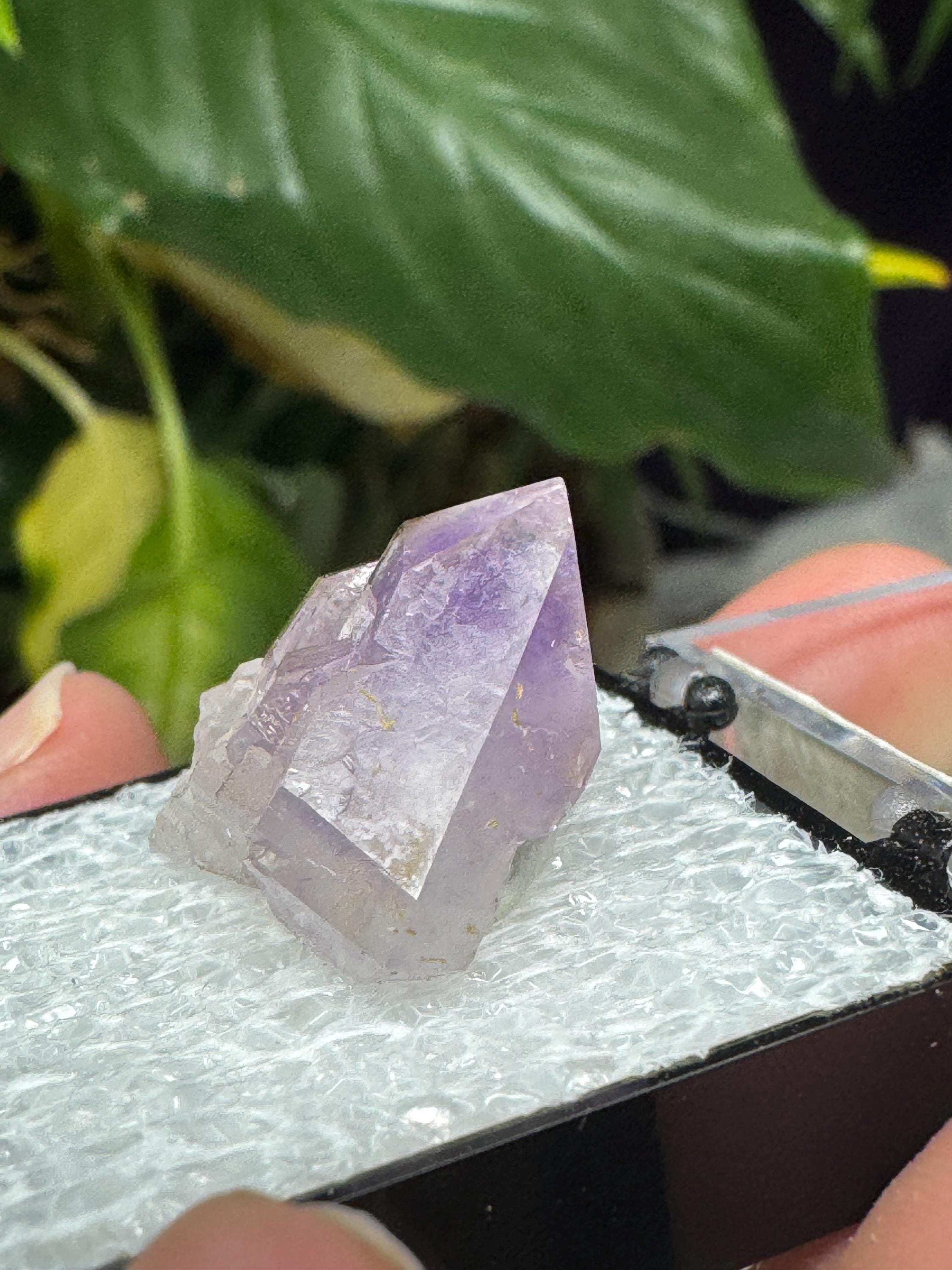 Amethyst Thumbnail from The Miracle Pocket at Purple Place Prospect in Cabarrus County, North Carolina. Beautiful amethyst with luster and lilac color. Fits in a Thumbnail 1” perky box.