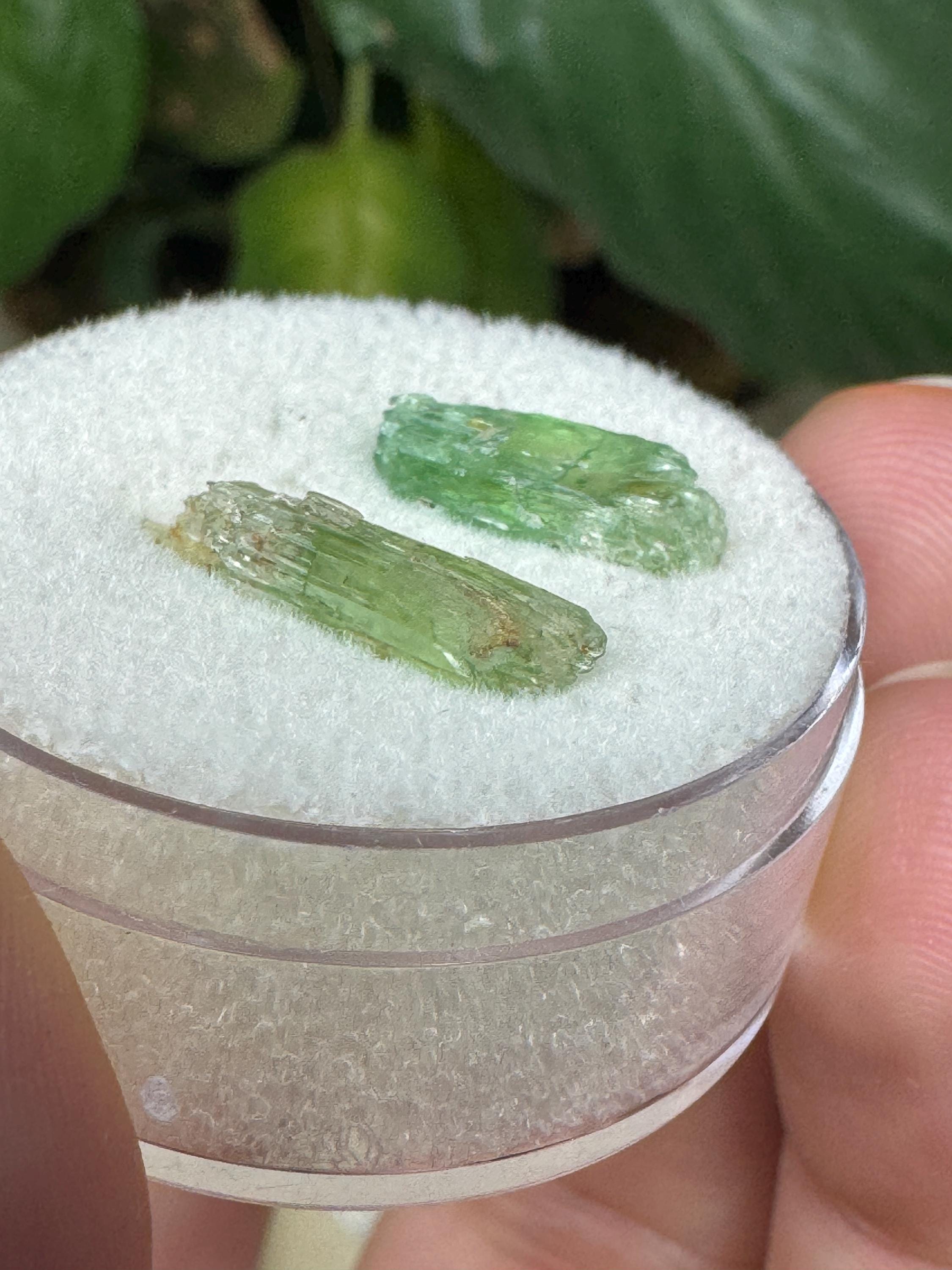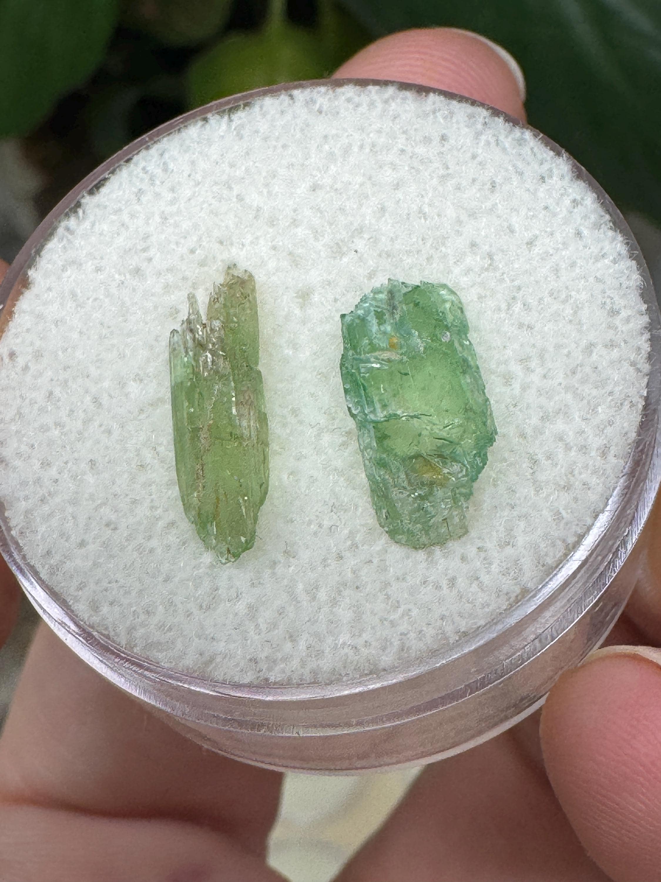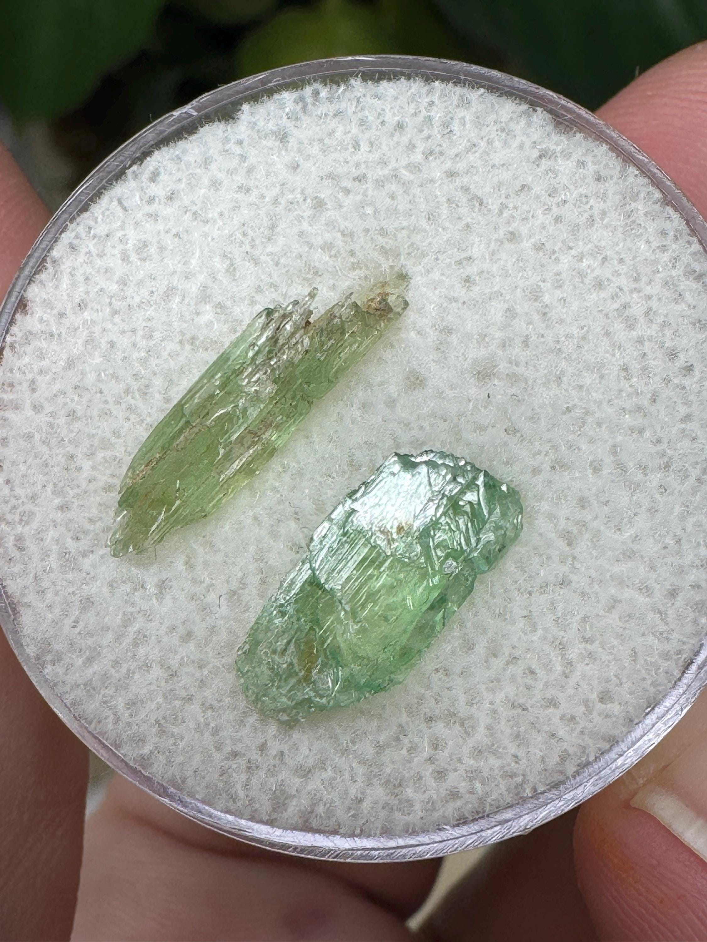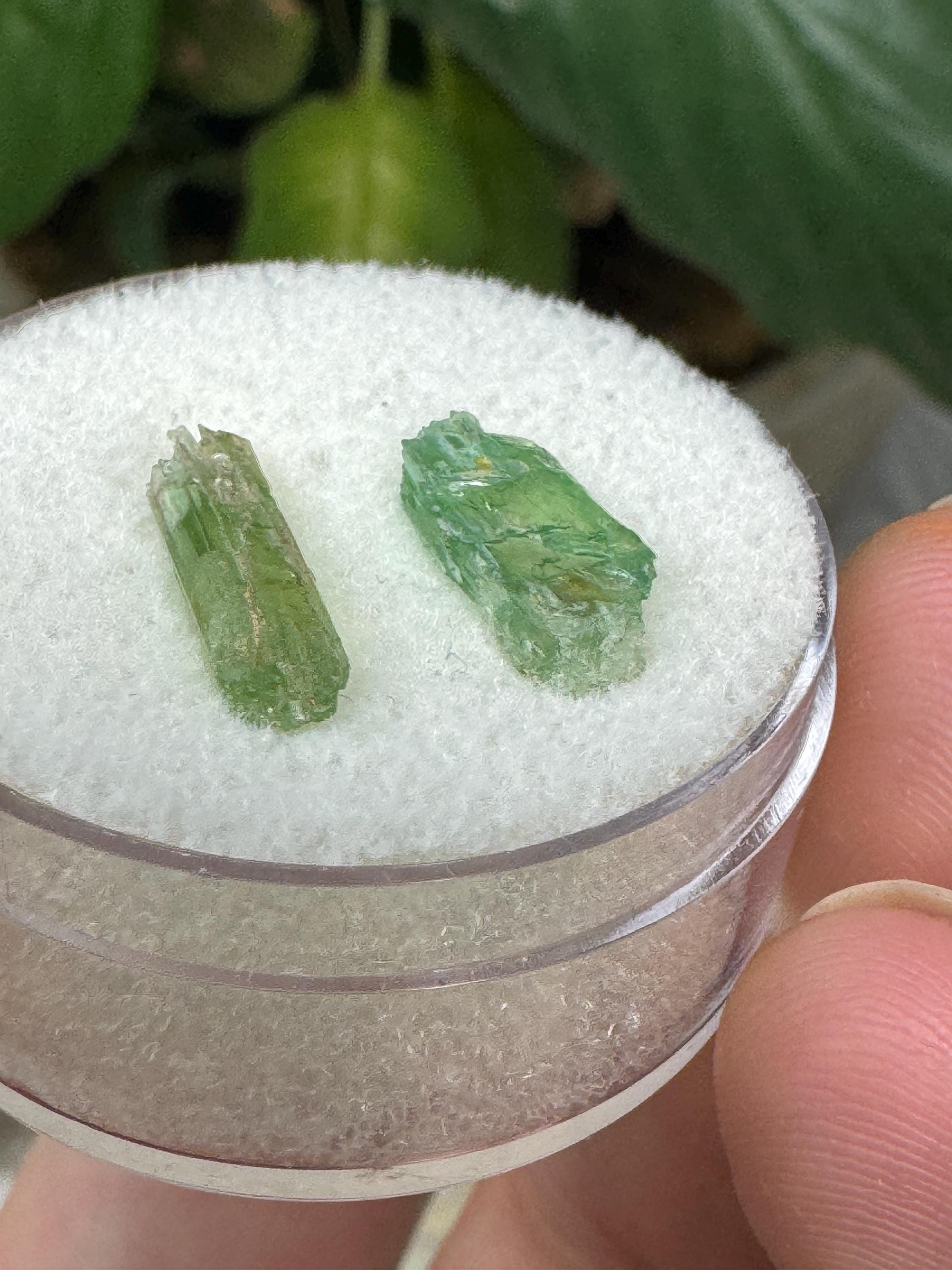 2 Beautiful Hiddenite from Hiddenite NC, Adams Farm. Good color and terminations. Mined by Terry Ledford in 2007. Comes in a 1" case. 5.5ct. total 1.5/1.2cmAll minerals come with a collection card.