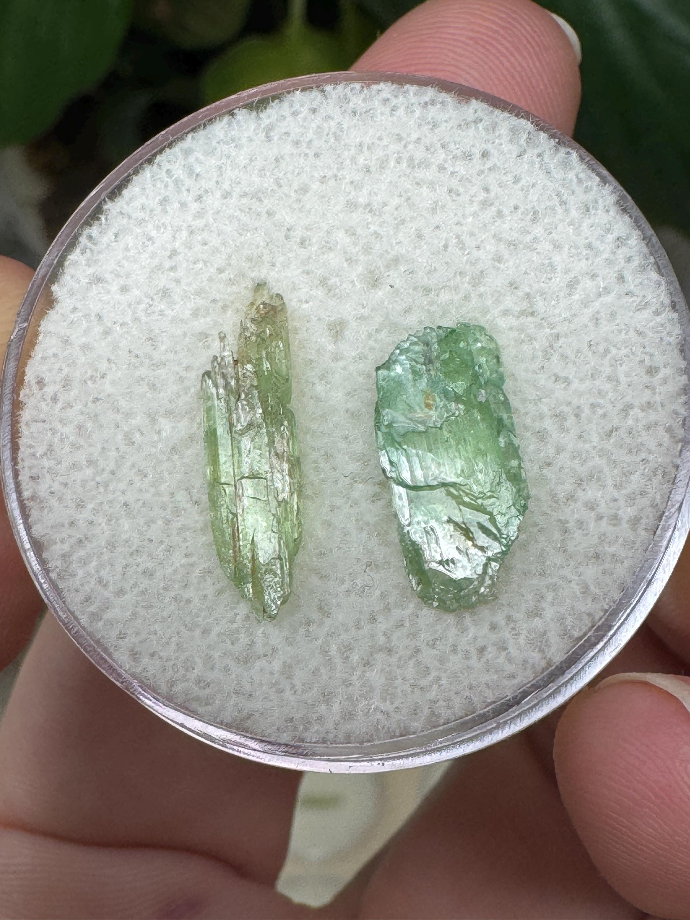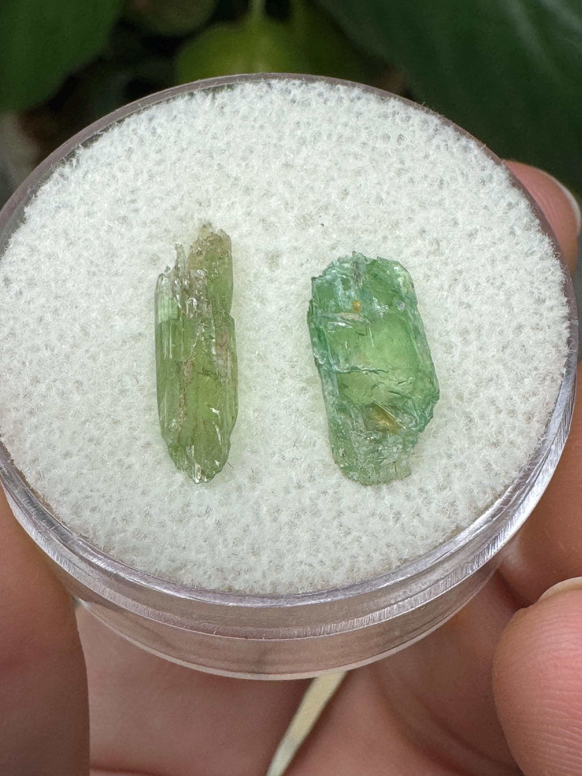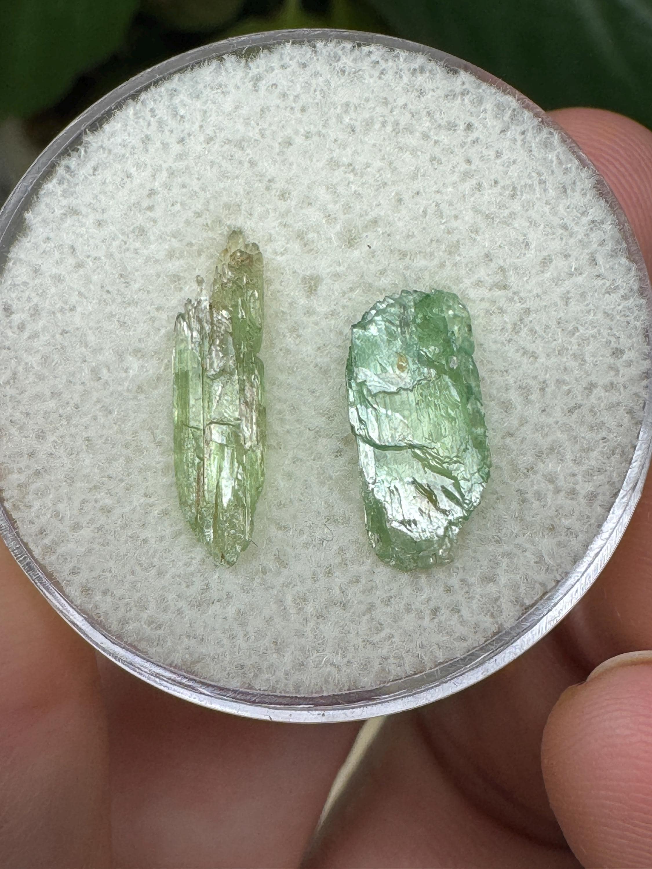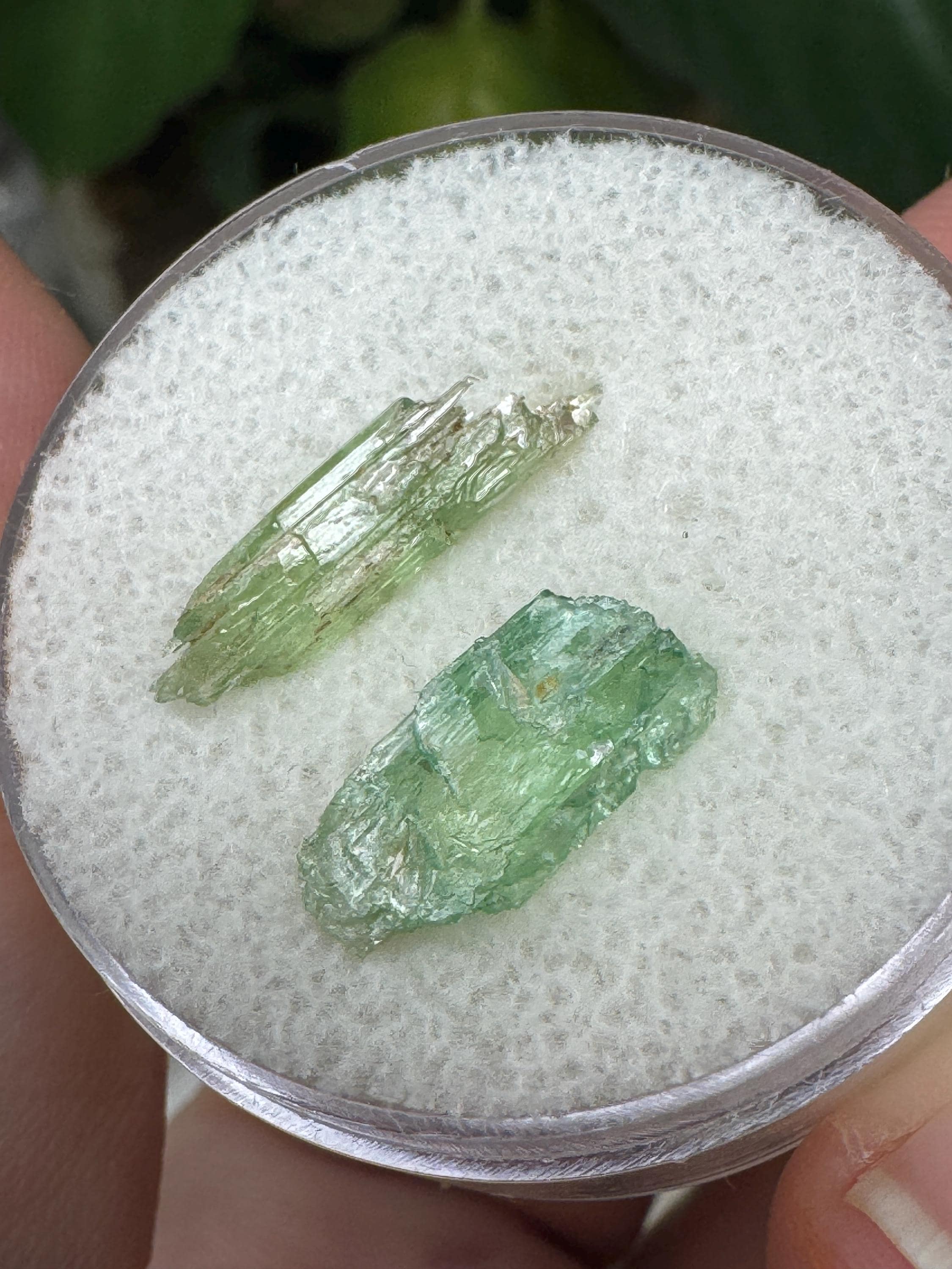 2 Beautiful Hiddenite from Hiddenite NC, Adams Farm. Good color and terminations. Mined by Terry Ledford in 2007. Comes in a 1" case. 5.5ct. total 1.5/1.2cmAll minerals come with a collection card.