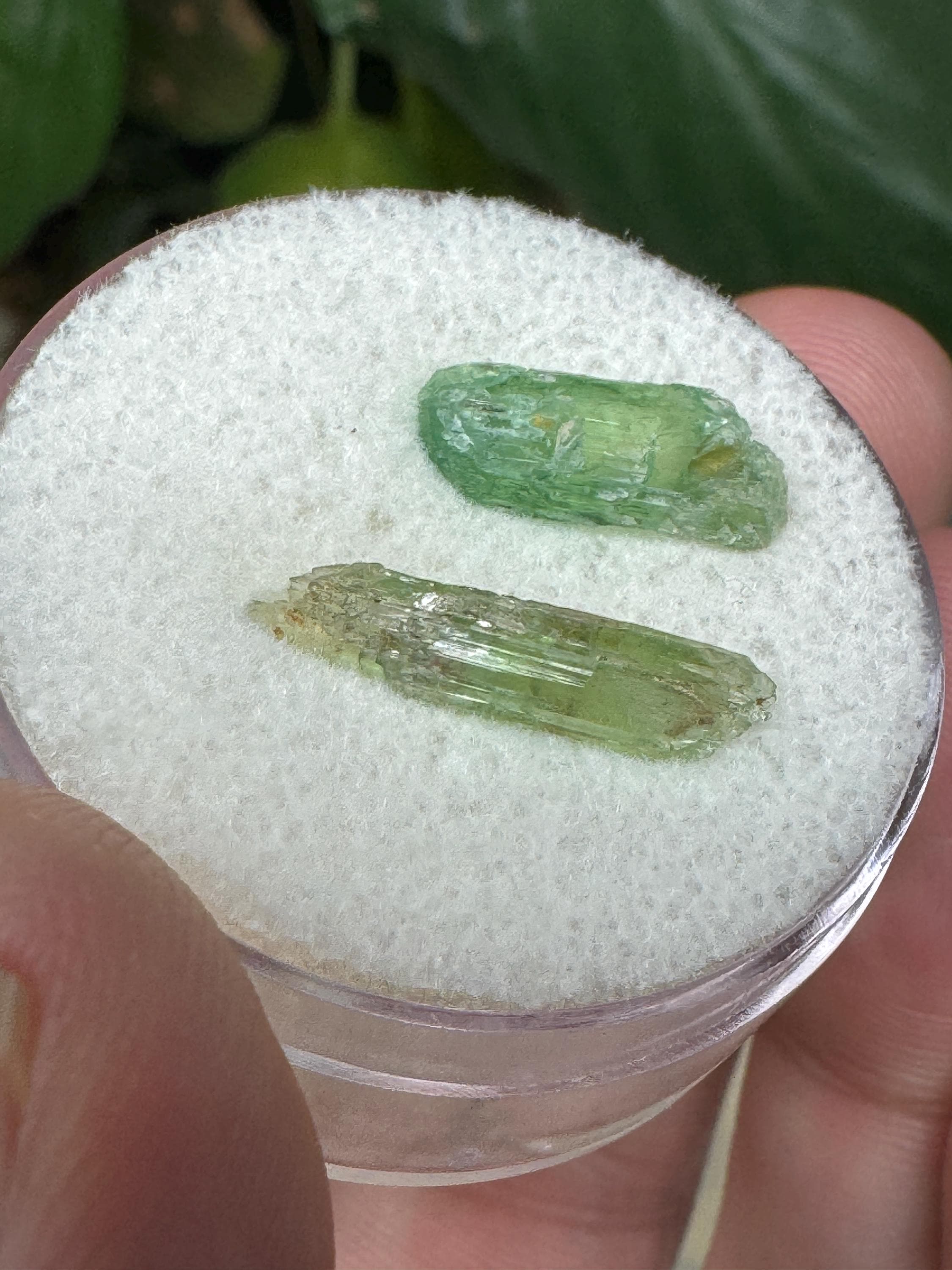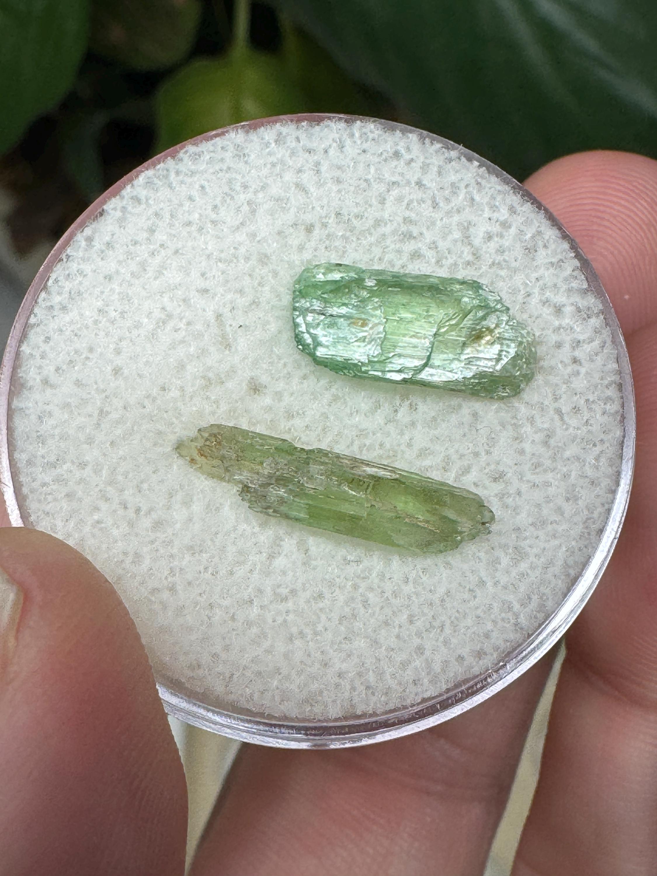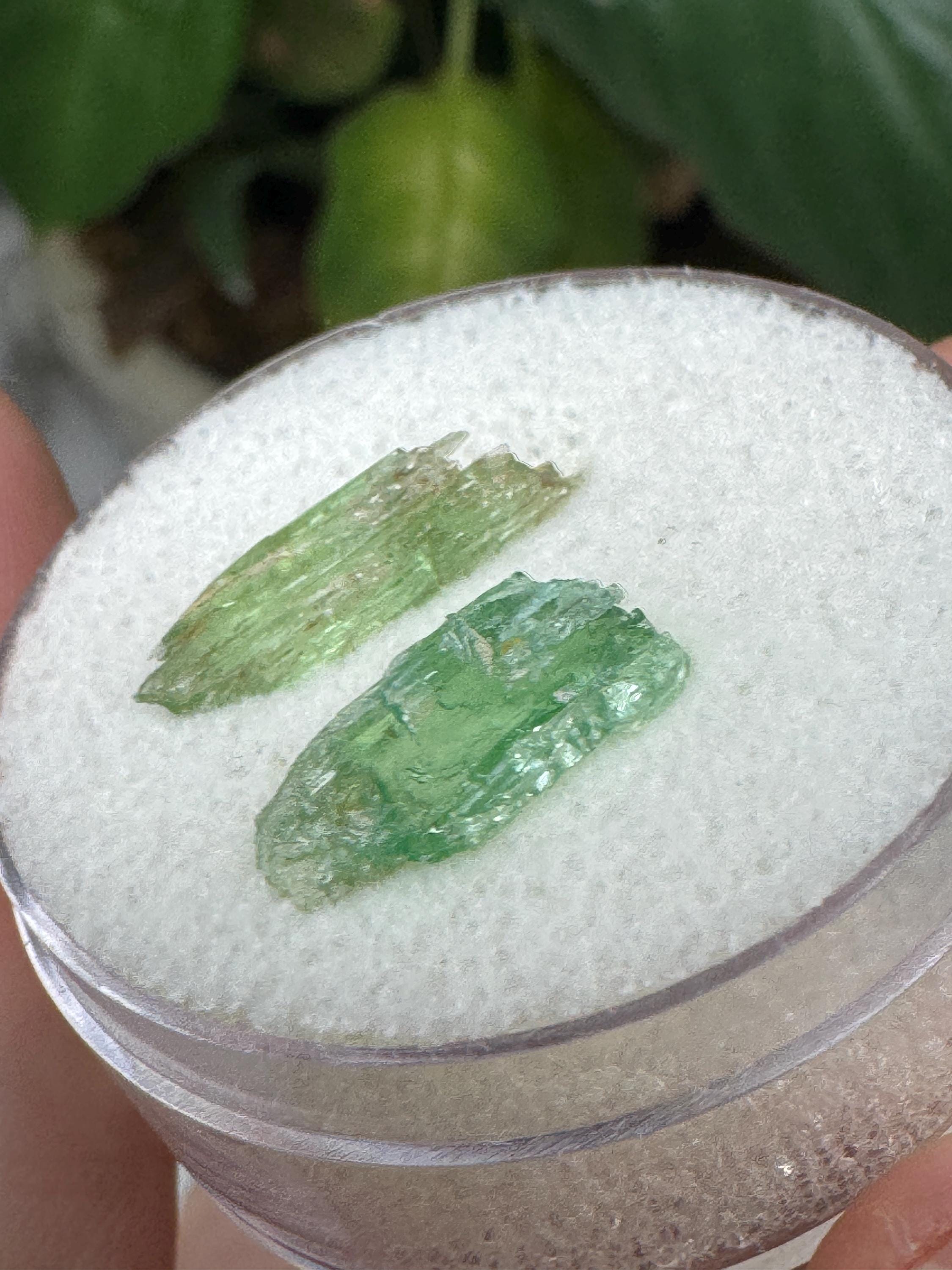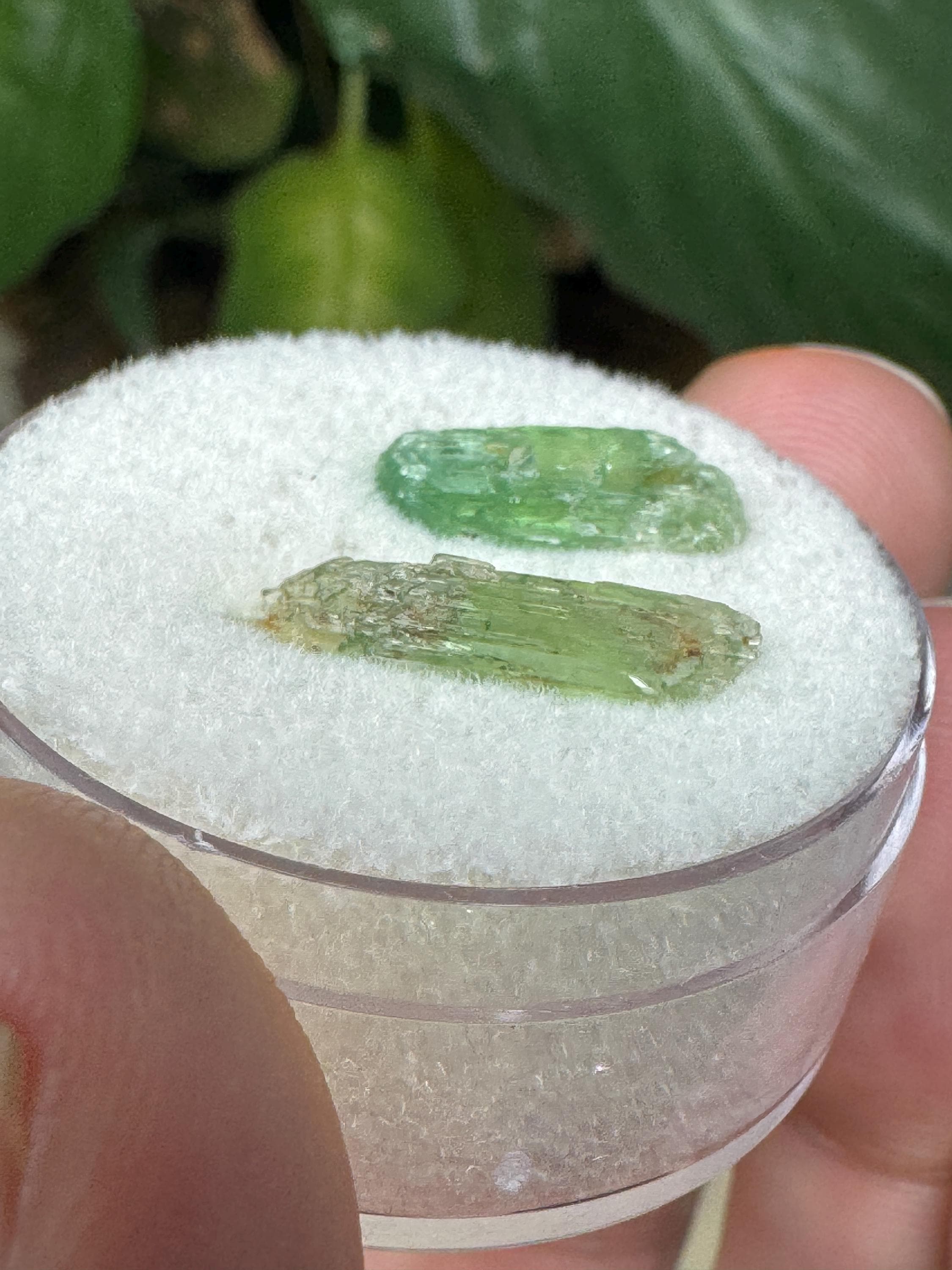 2 Beautiful Hiddenite from Hiddenite NC, Adams Farm. Good color and terminations. Mined by Terry Ledford in 2007. Comes in a 1" case. 5.5ct. total 1.5/1.2cmAll minerals come with a collection card.