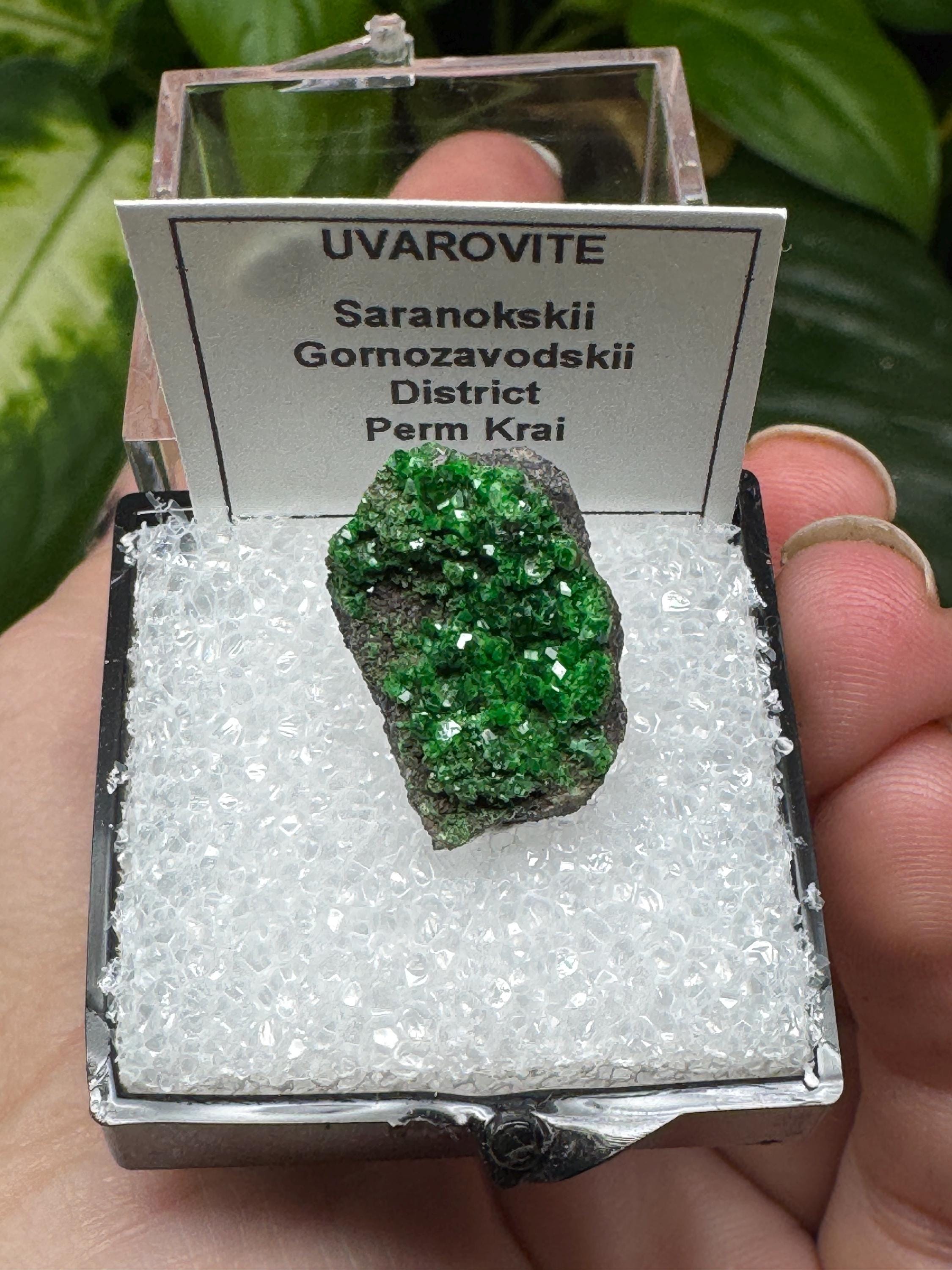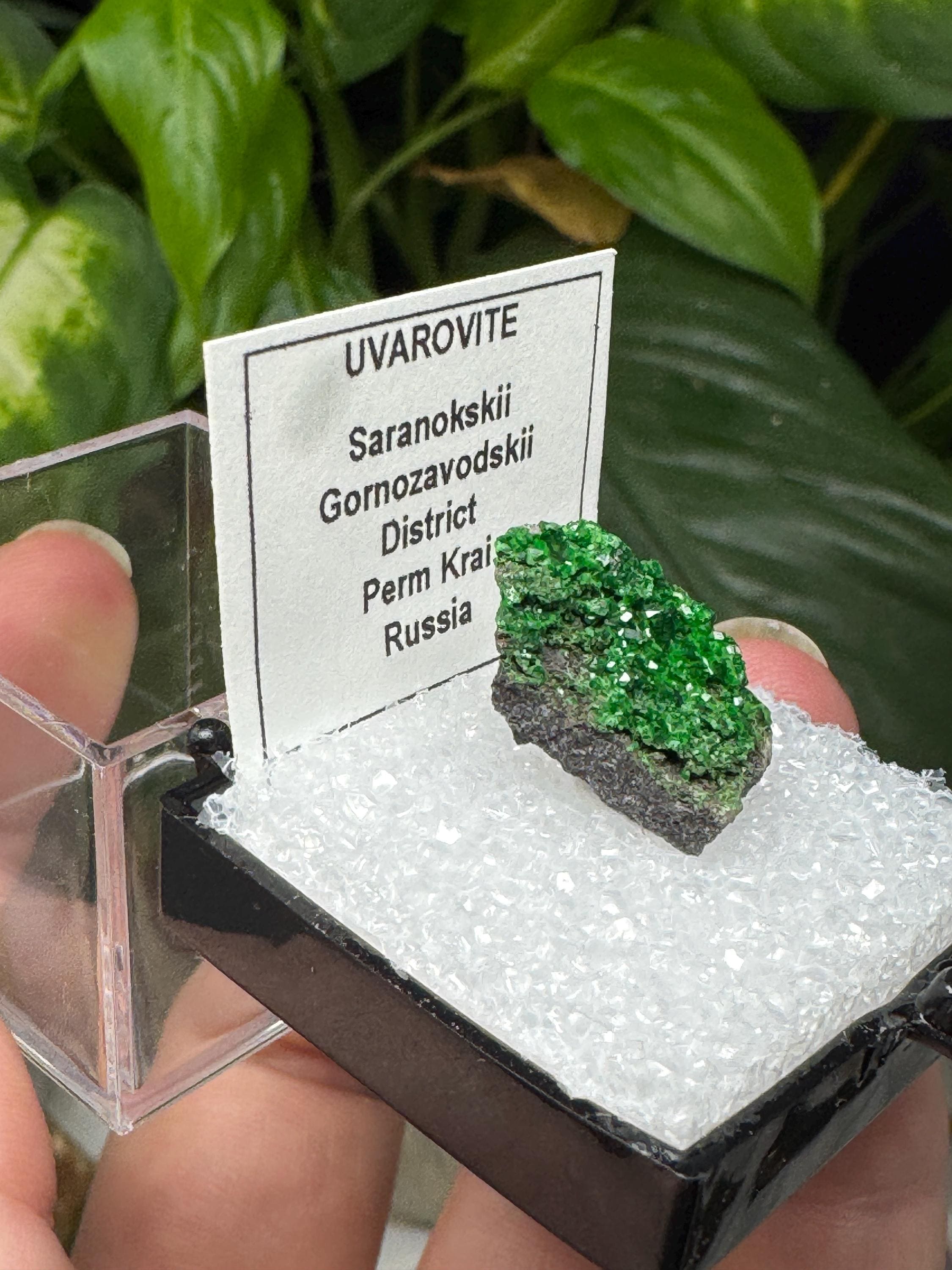 Uvarite Garnet from Perm Krai, Russia. This specimen has beautiful micro green garnets. Thumbnail Size, Comes in a 1" perky box.