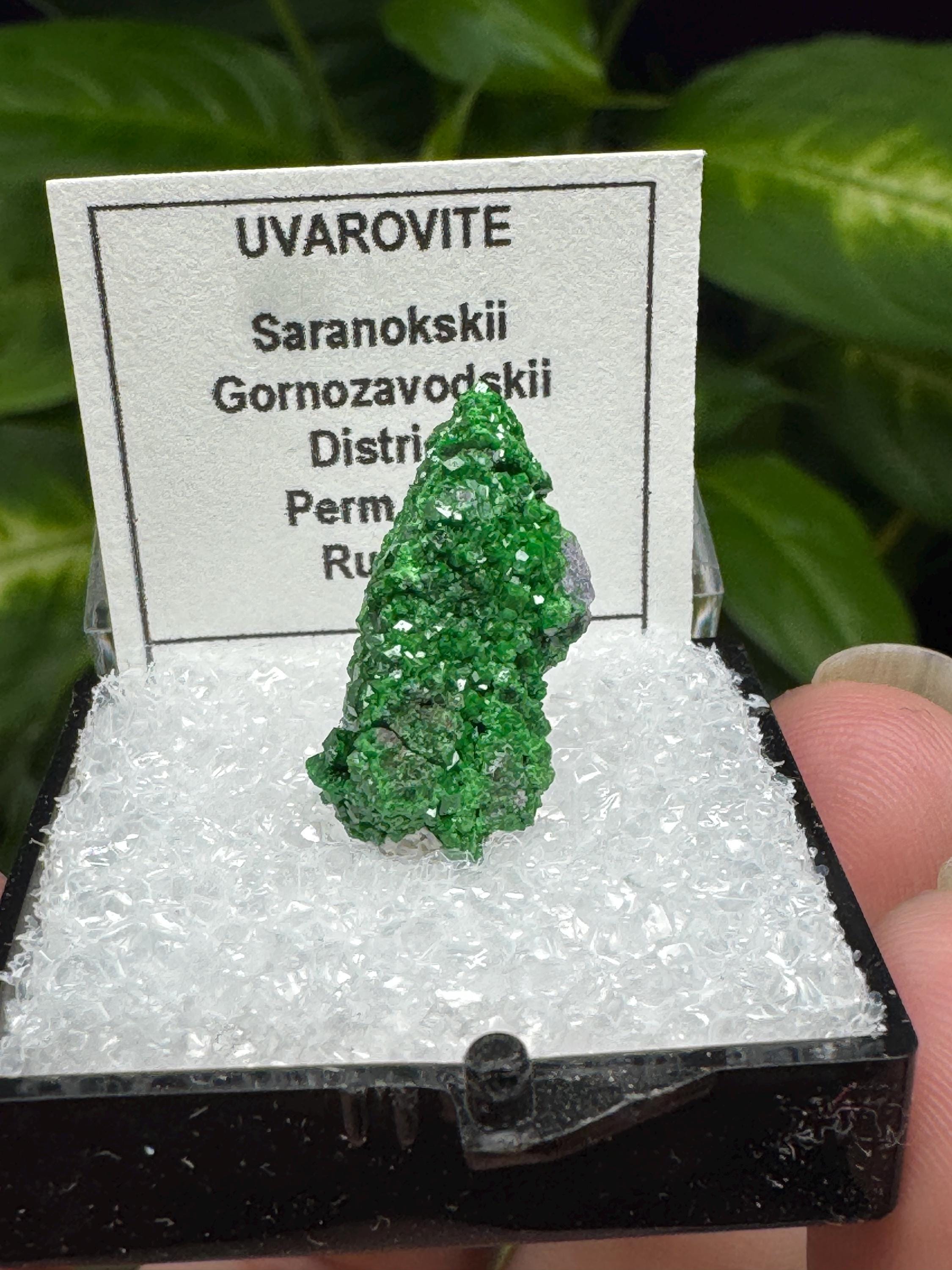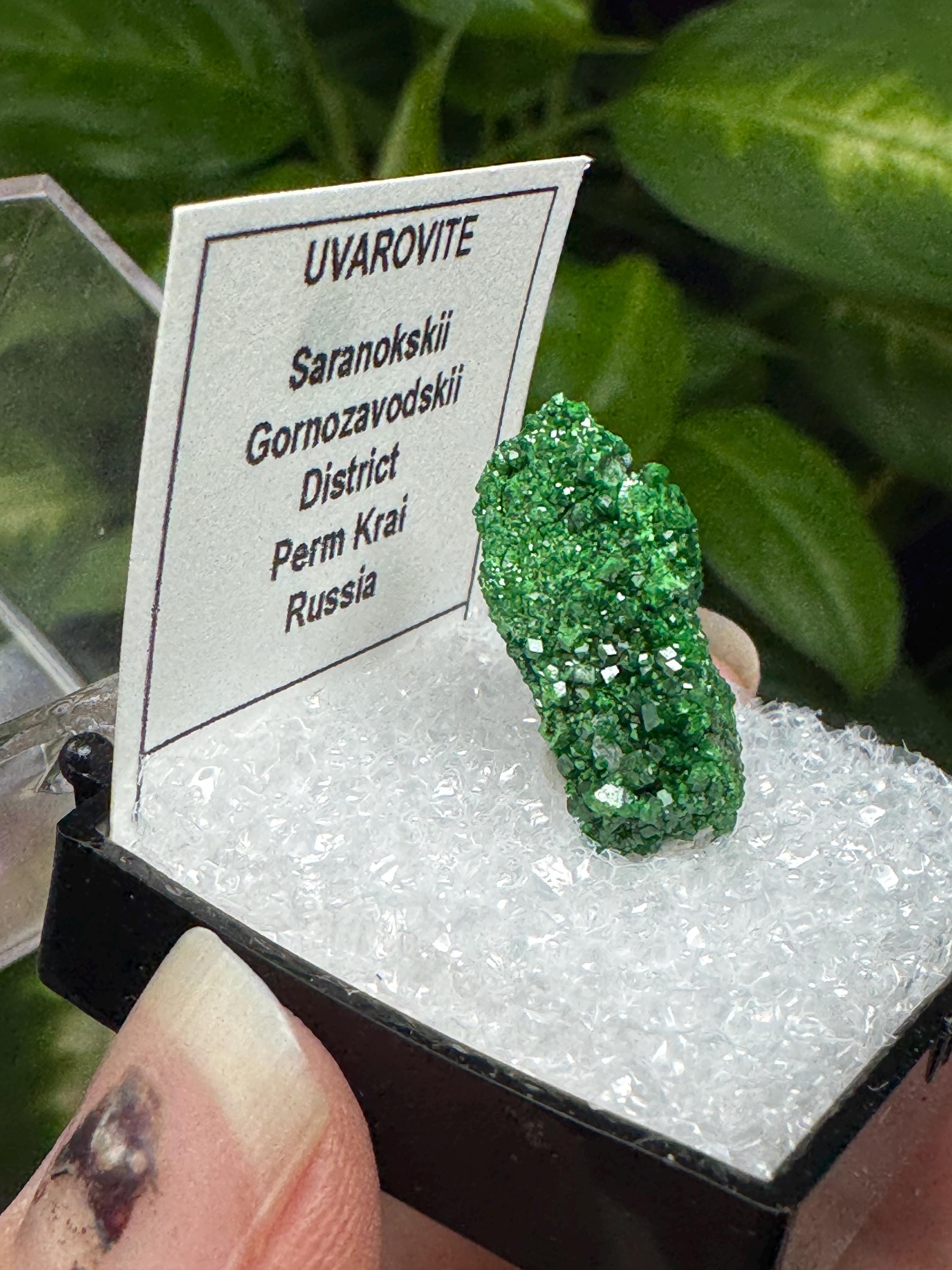 Uvarite Garnet from Perm Krai, Russia. This specimen has beautiful micro green garnets. Thumbnail Size, Comes in a 1" perky box.