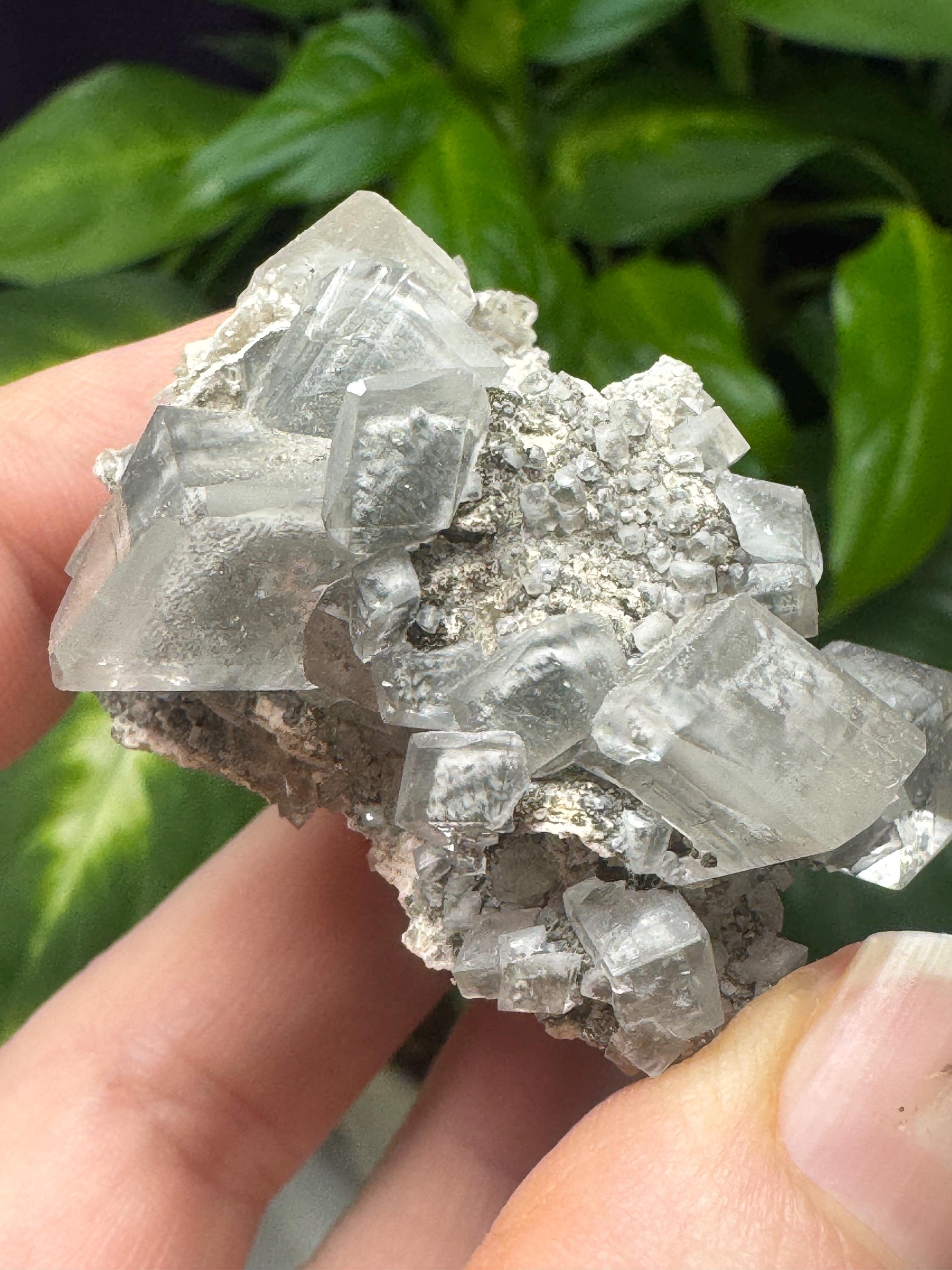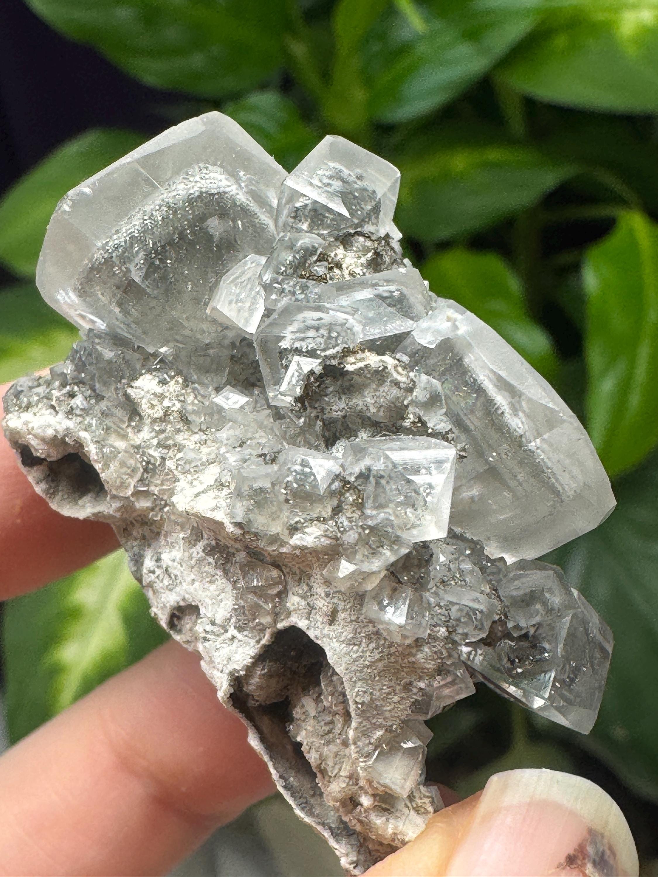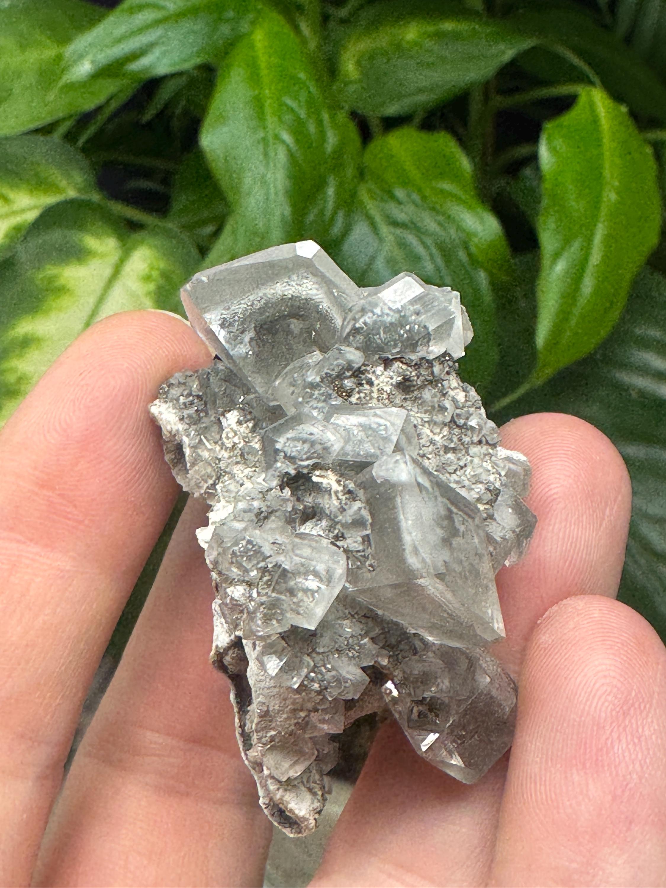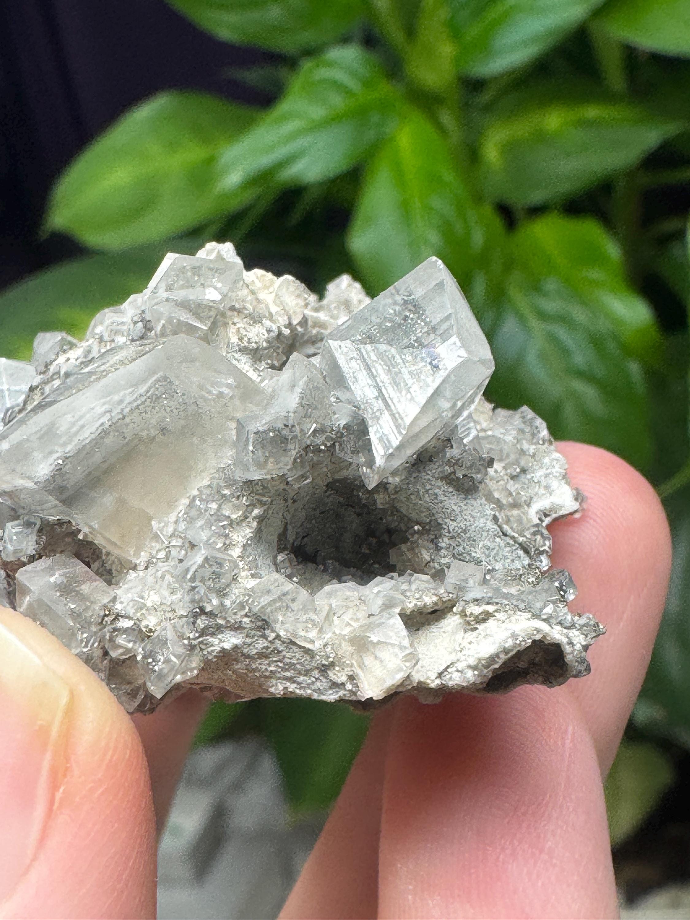 Calcite cluster with Marcasite Inclusions from Linwood Mine, Scott County, Iowa. Clear calcite crystals with Marcasite on matrix. 4.5 x 3.5cm