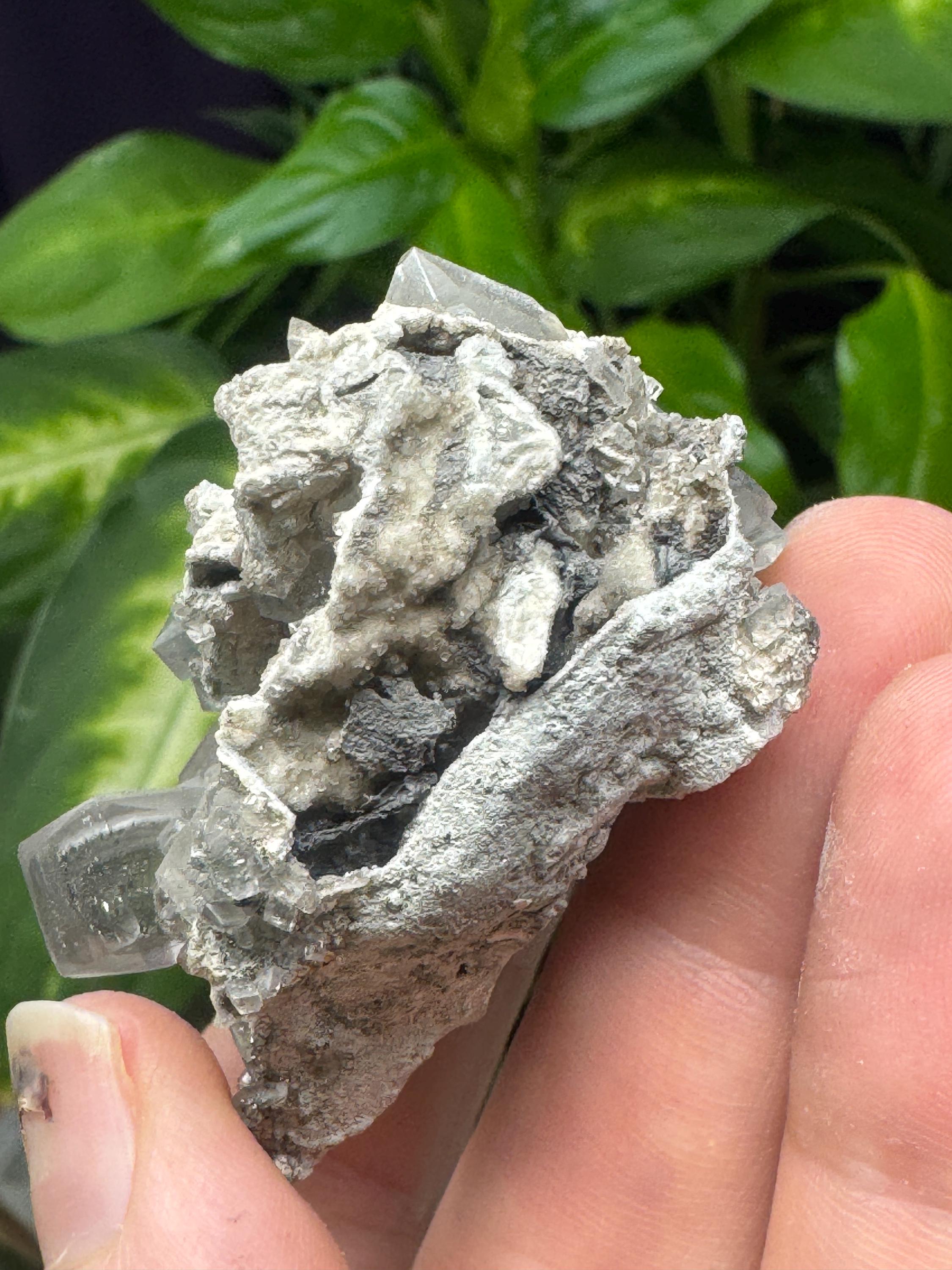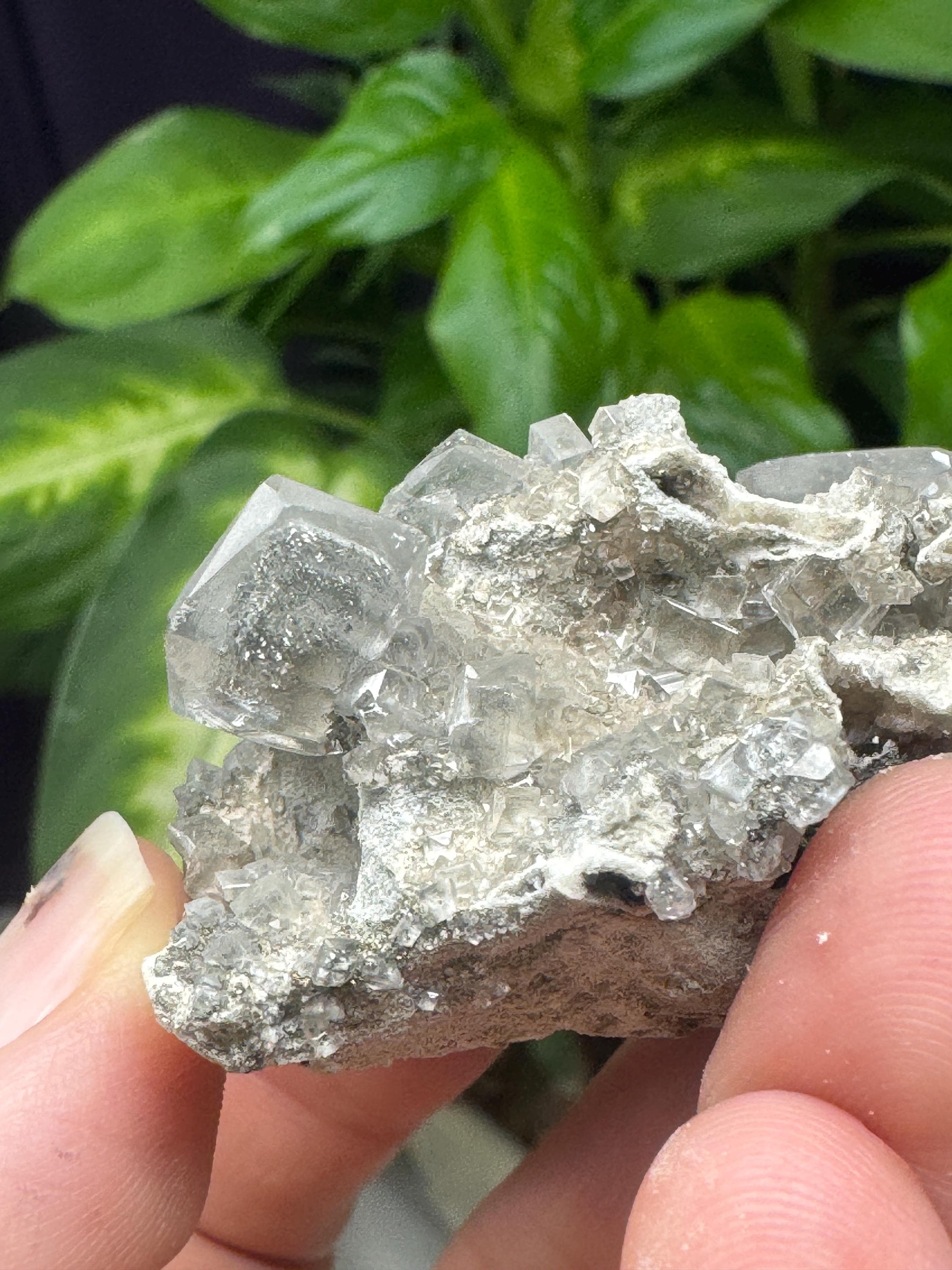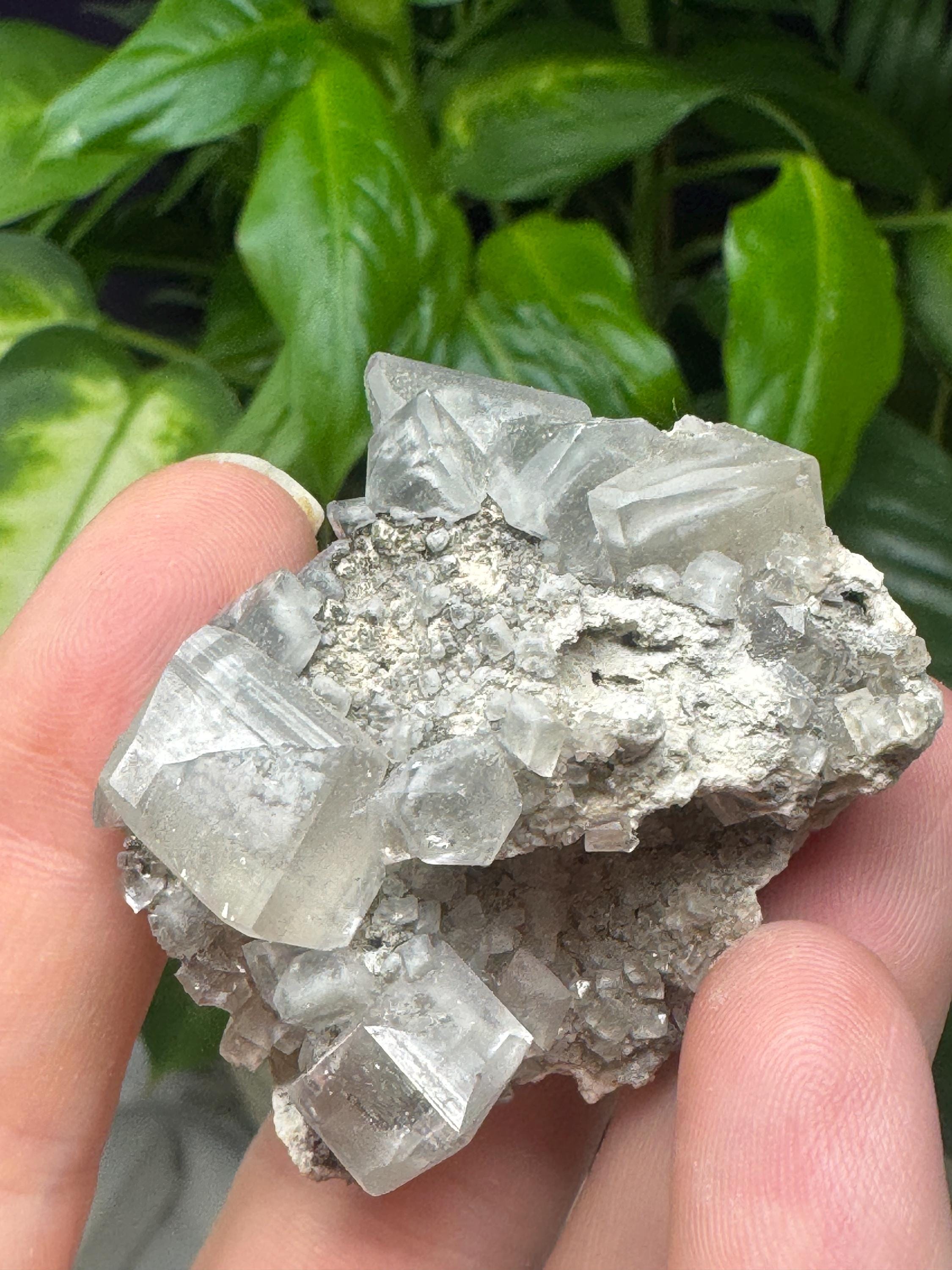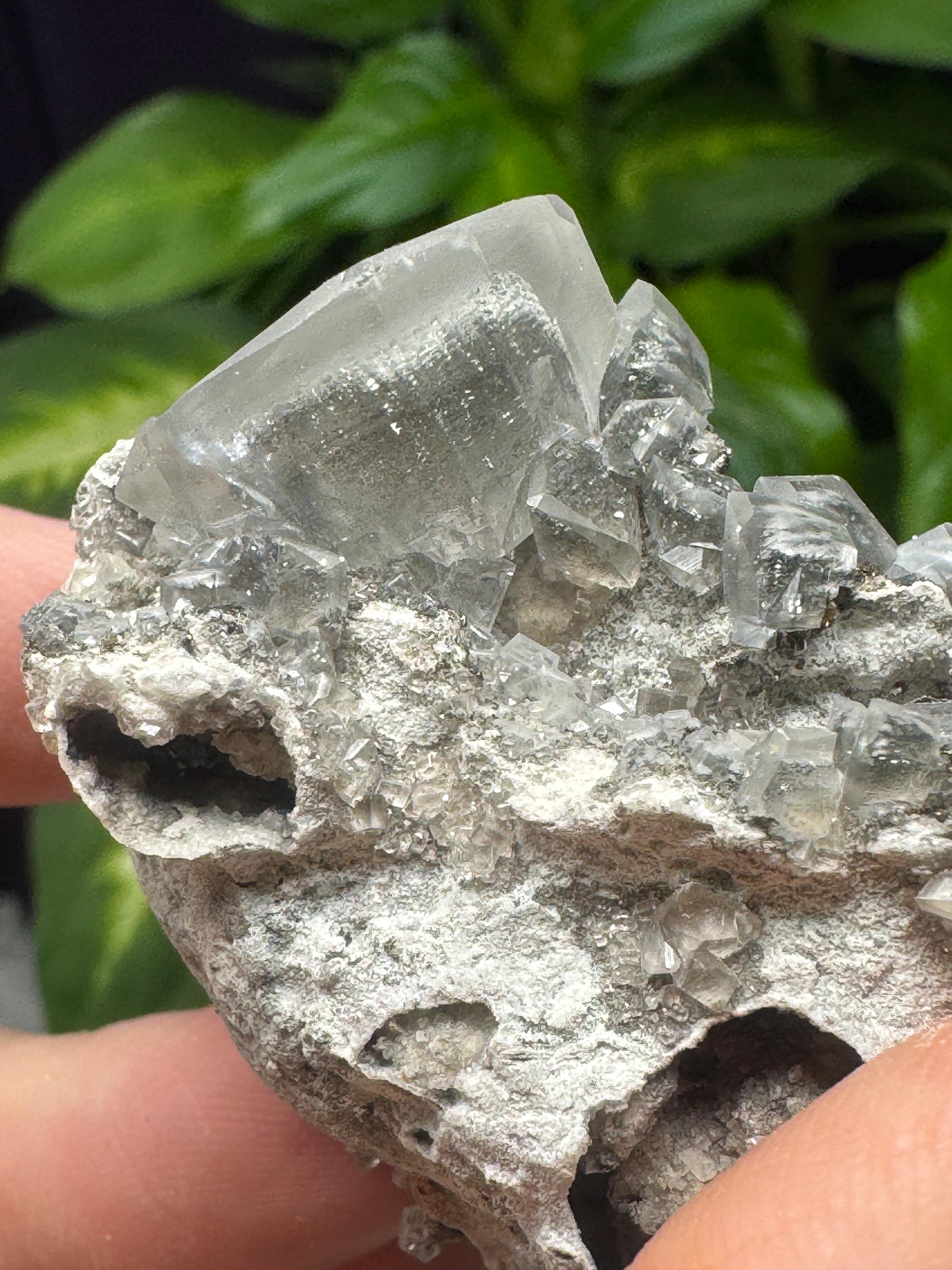 Calcite cluster with Marcasite Inclusions from Linwood Mine, Scott County, Iowa. Clear calcite crystals with Marcasite on matrix. 4.5 x 3.5cm
